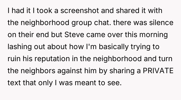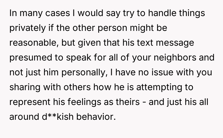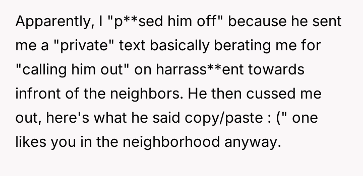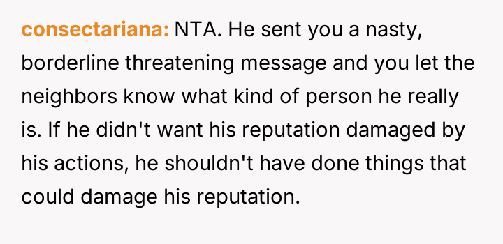 Was the OP justified in sharing the neighbor's private, aggressive text message publicly to defend themselves against ongoing h***ssment, or did this action cross an ethical line by intentionally damaging the neighbor's reputation within the community?