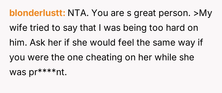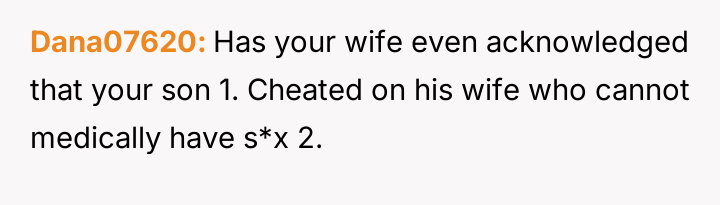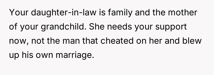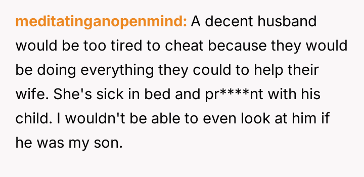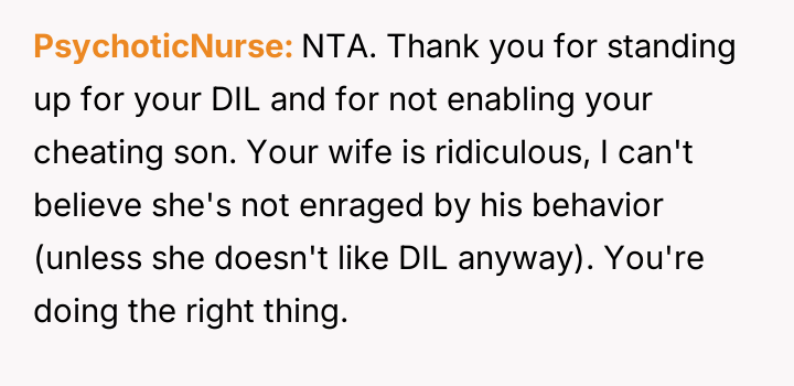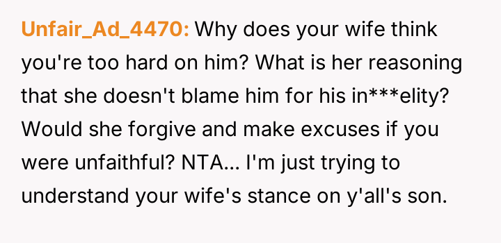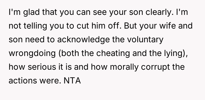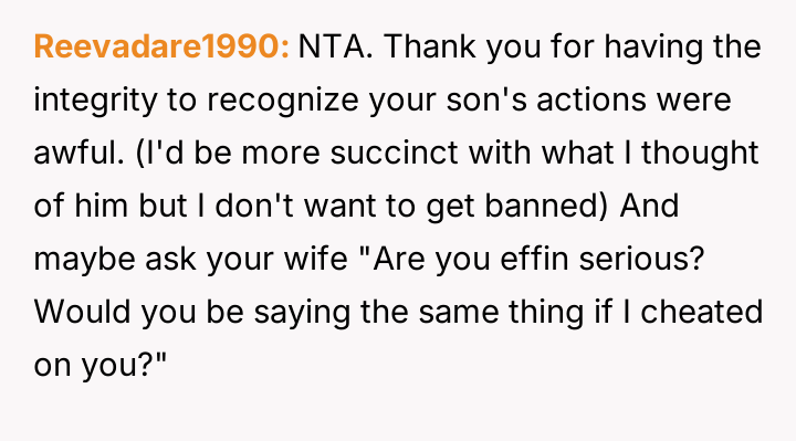 The original poster (OP) is facing a severe conflict between their deep moral disapproval of their son's in***elity and their spouse's desire to offer support and a chance for reconciliation.