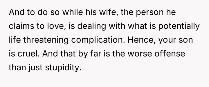 Given the absolute breach of trust during a vulnerable medical situation, is the OP justified in prioritizing their immediate moral boundary and refusing to host their son, or should they defer to their spouse's plea to allow the couple time to attempt repair under their roof?