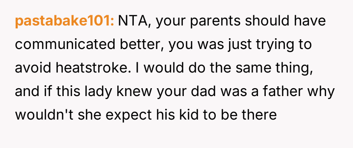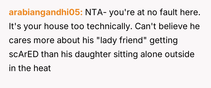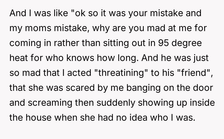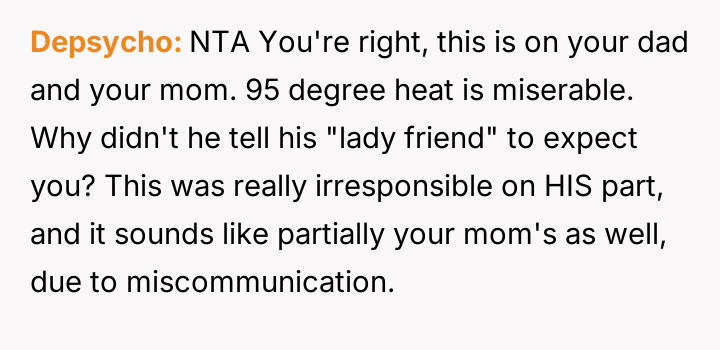 The original poster (OP) faced a difficult situation involving miscommunication about custody exchange times and extreme heat, leading them to enter their father's home via an unlocked window for safety.