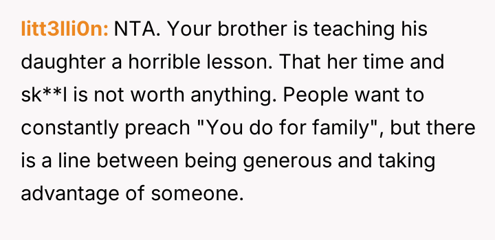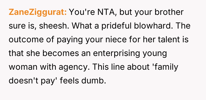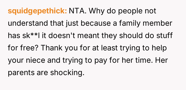 The original poster (OP) faced a conflict where they supported their niece's ambition to pay for culinary school by offering payment for a service, directly contradicting the wishes of the niece's parents who insisted on free labor based on family obligation.