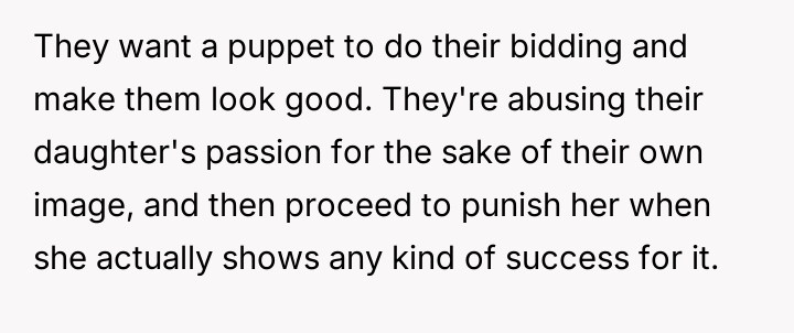 But the very people who should have supported her—her parents—saw her dream as a distraction, demanding she give away her talent for free, draining her hope and resources.