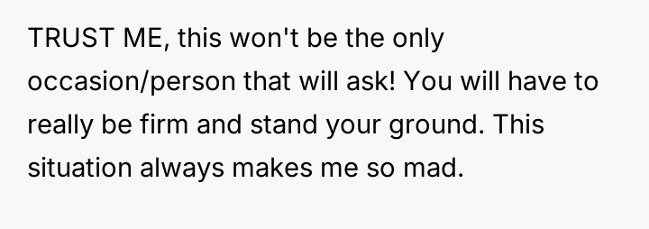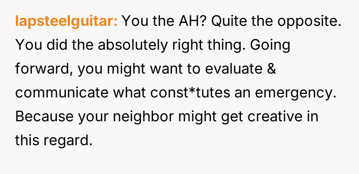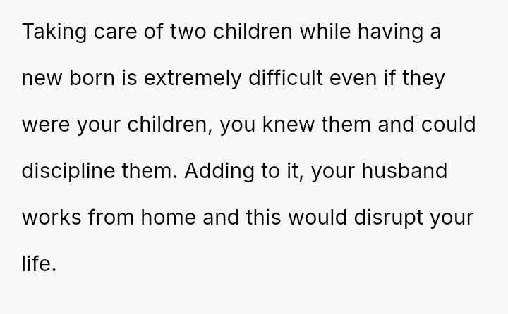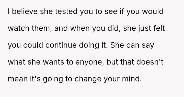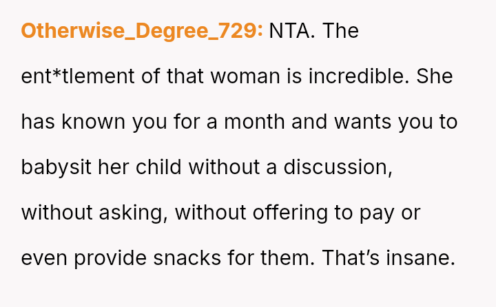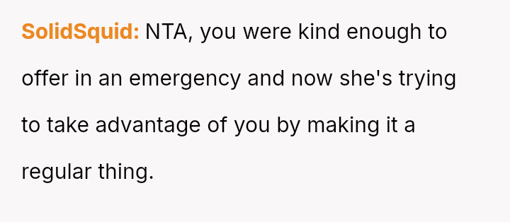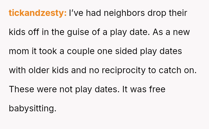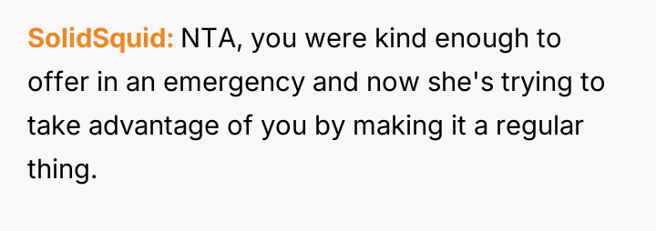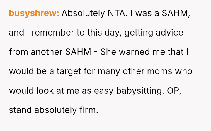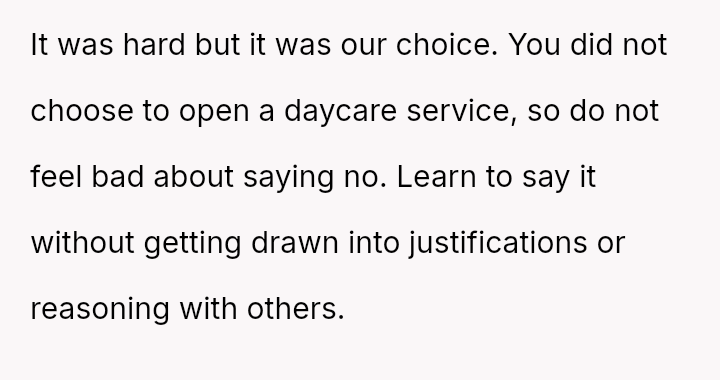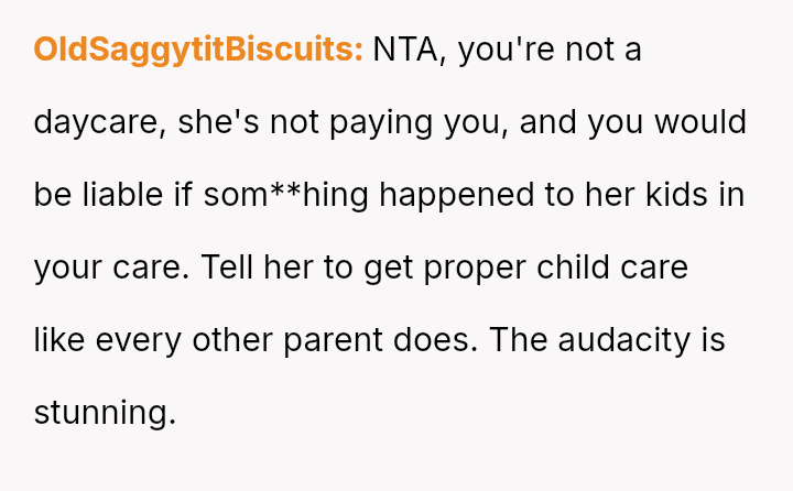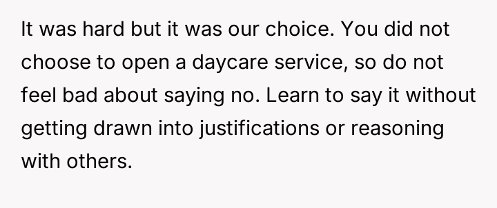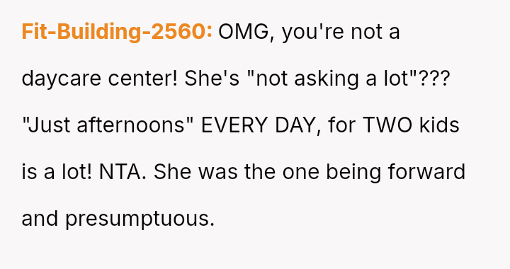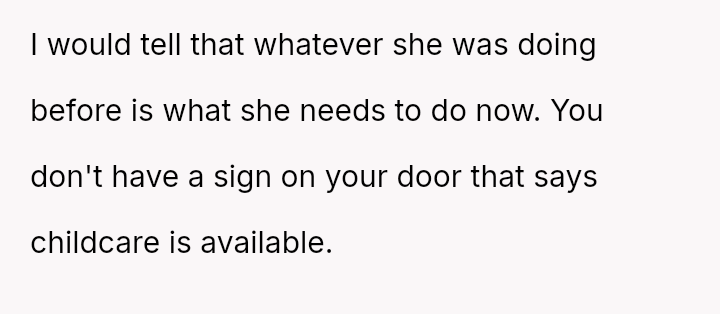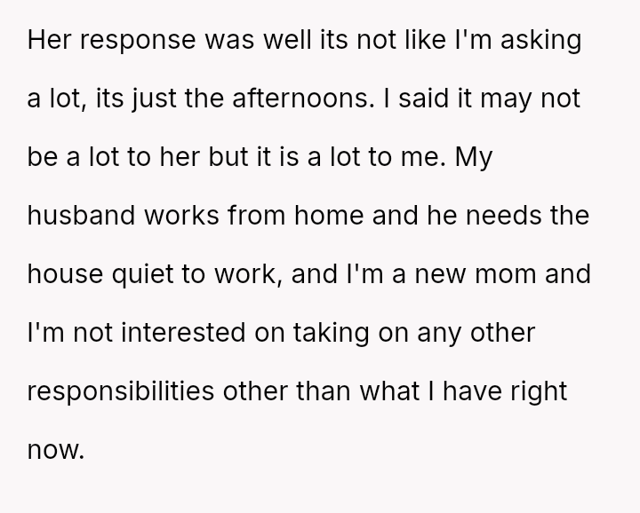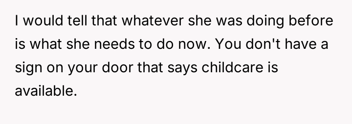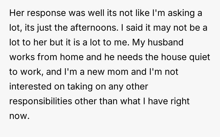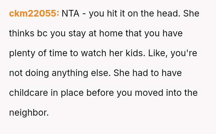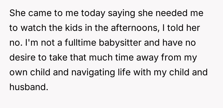 When the neighbor later requested that the OP provide regular afternoon childcare, the OP declined, stating she did not want to take on the responsibility and needed time dedicated to her own infant and husband, who works from home.