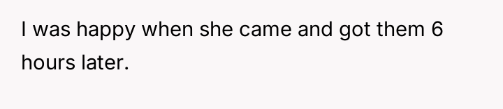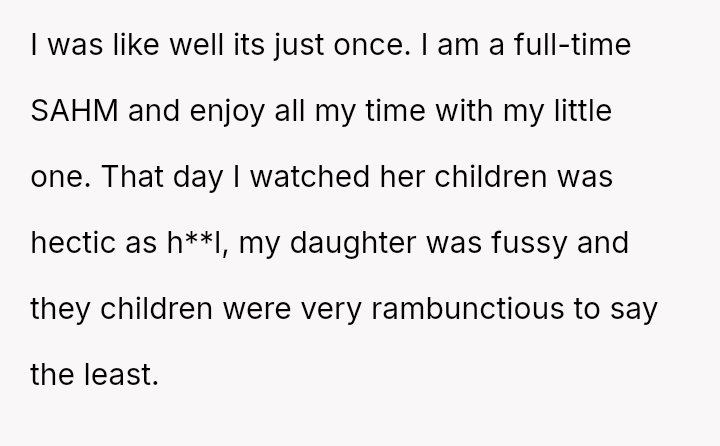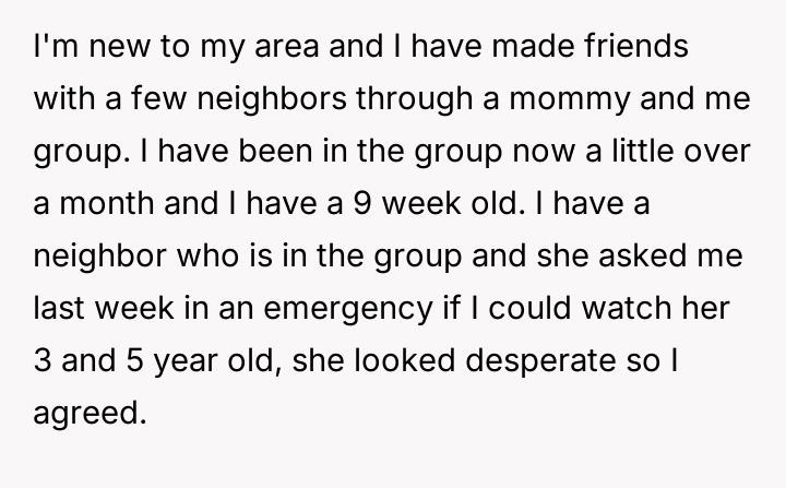 Early on, the neighbor asked the OP, a full-time stay-at-home mother with a nine-week-old, to watch her children in an emergency, which the OP agreed to for a single, difficult six-hour period.