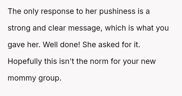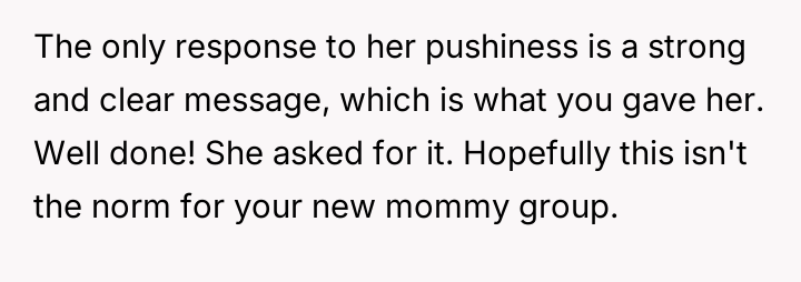 The OP is currently facing a conflict between es**blishing necessary boundaries for her new role as a mother to an infant and the expectations placed upon her by a new acquaintance who seems to feel ent*tled to her time because she is home during the day.
