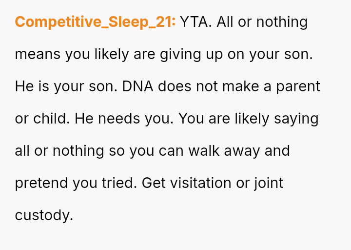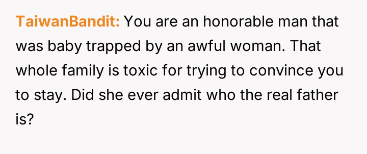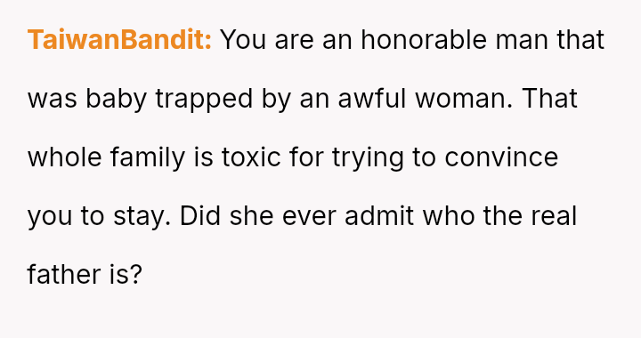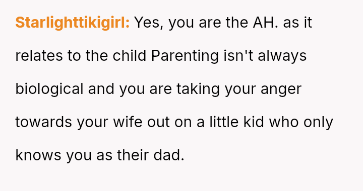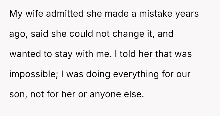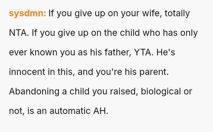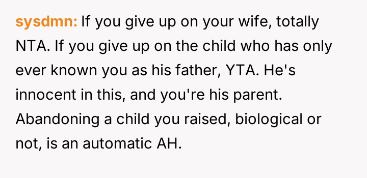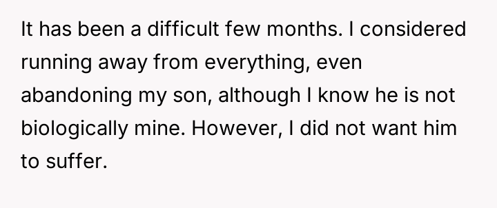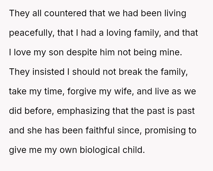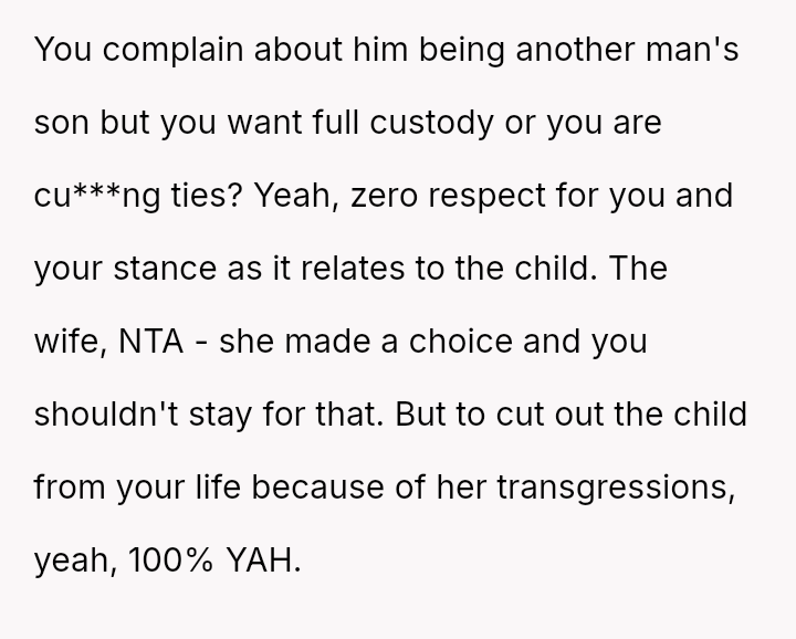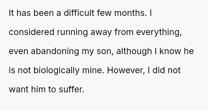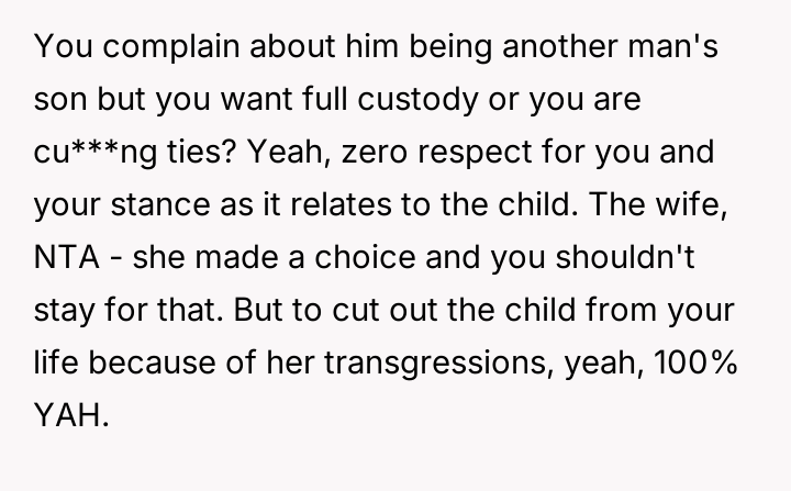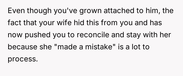 Given the OP's firm stance on divorce but his conflicted feelings about abandoning the child he loves, the core question remains: Is the OP justified in prioritizing his emotional need for separation and truth by leaving entirely, or should he continue to sacrifice his personal integrity for the sake of maintaining a s**ble, albeit fraudulent, paternal relationship with the child?
