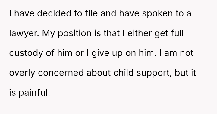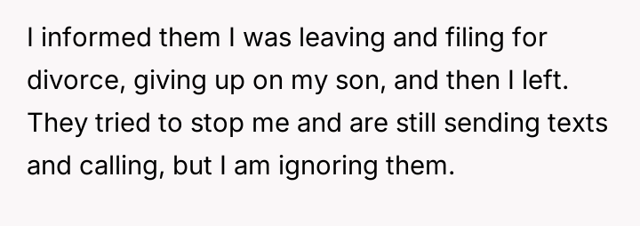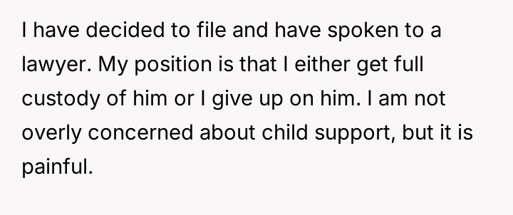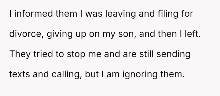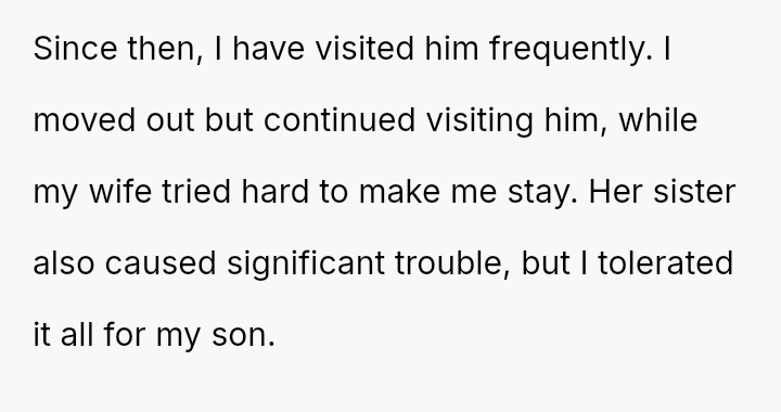 Despite his decision to leave and seek divorce, his primary motivation remains concern for the child, leading him to attempt continued involvement.