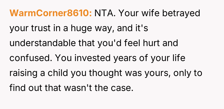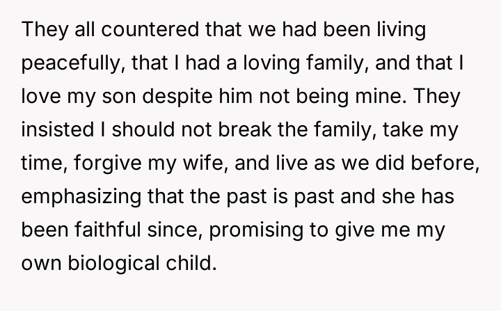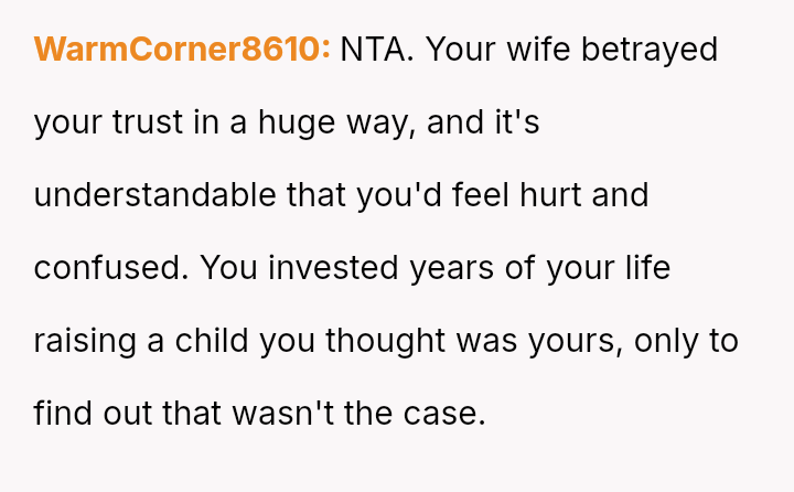 The original poster (OP) is grappling with a profound betrayal stemming from his wife's past in***elity and the subsequent revelation that the child he raised is not biologically his.