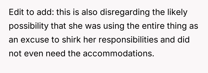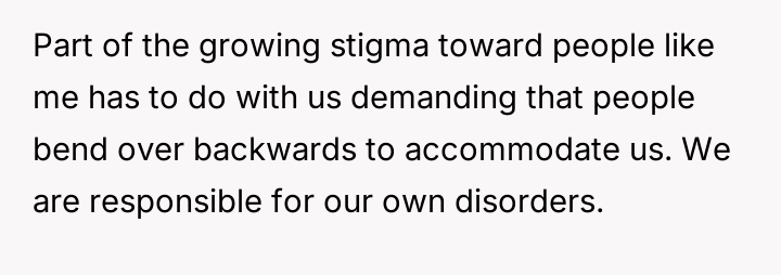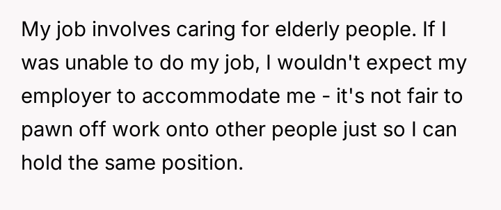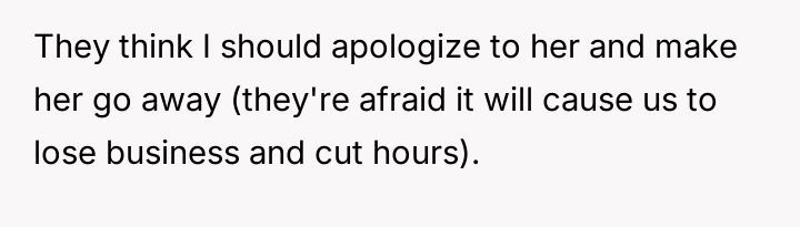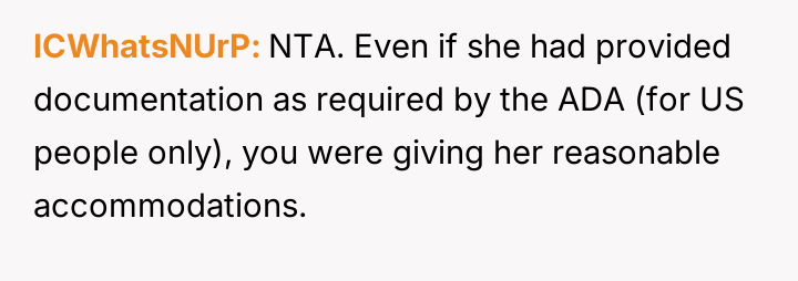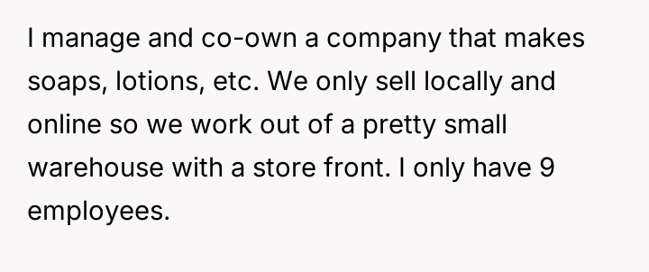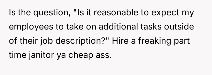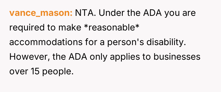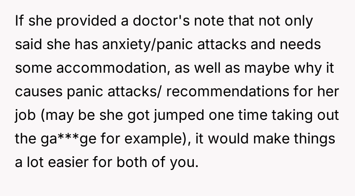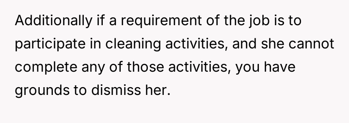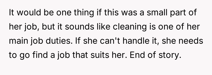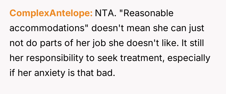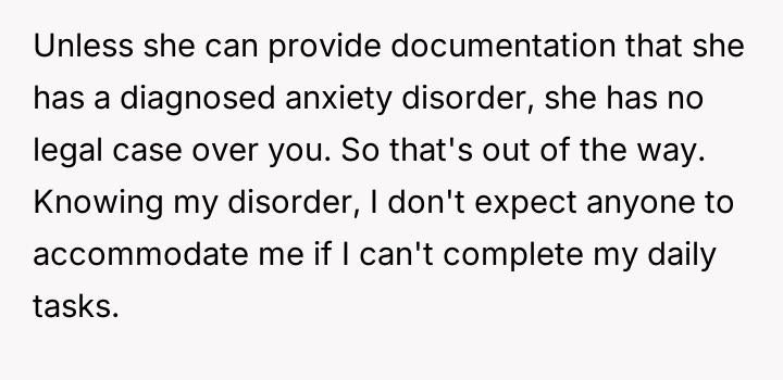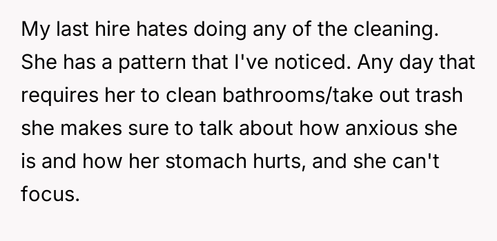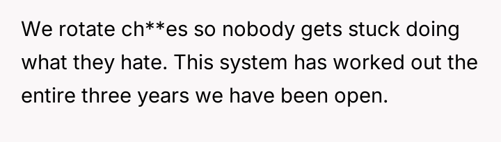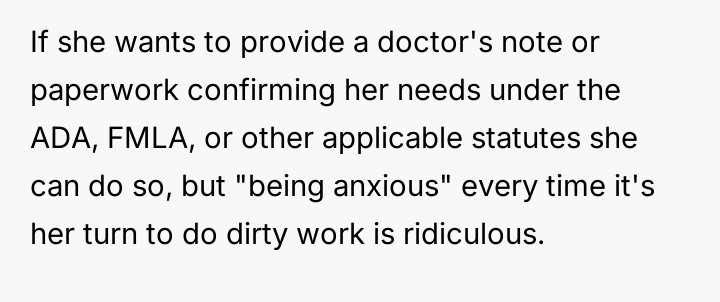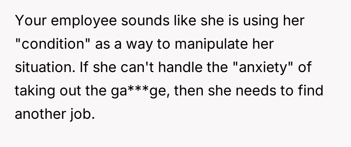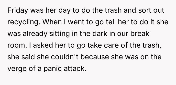 The business owner experienced a direct conflict when an employee refused to complete a rotating ch**e, claiming anxiety prevented her from taking out the trash.