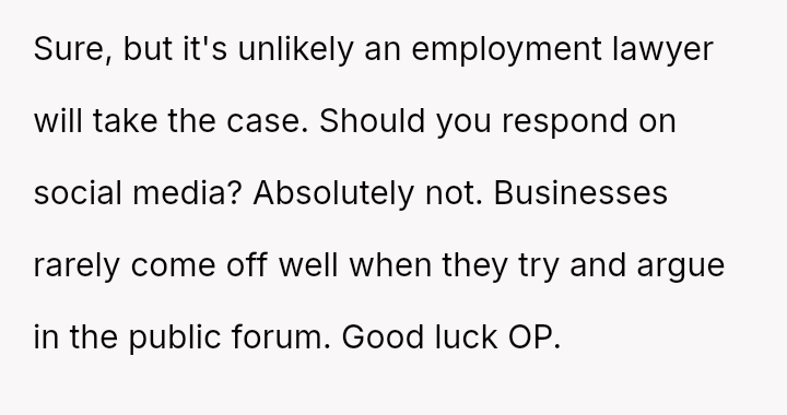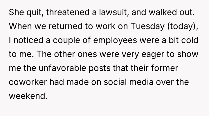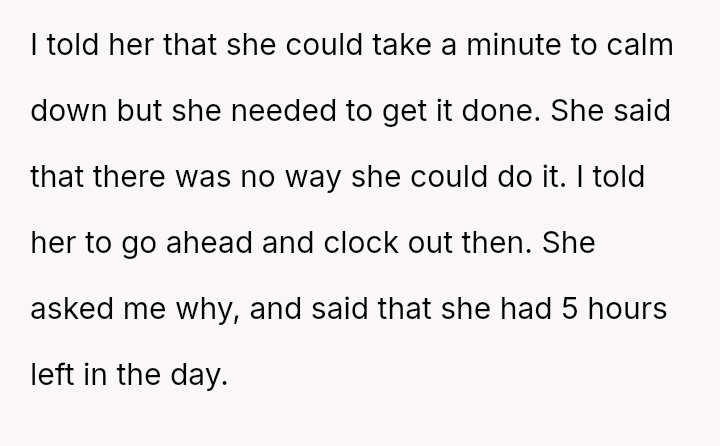The owner felt the employee was manipulating the system and ultimately sent her home, leading to the employee quitting and threatening legal action.