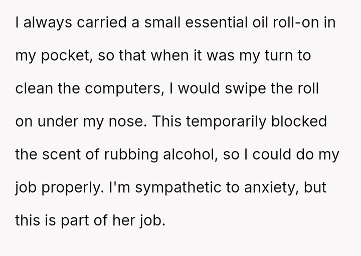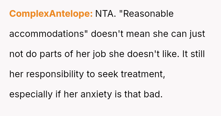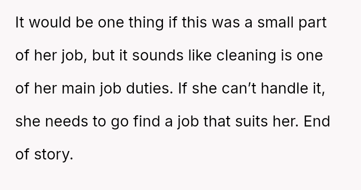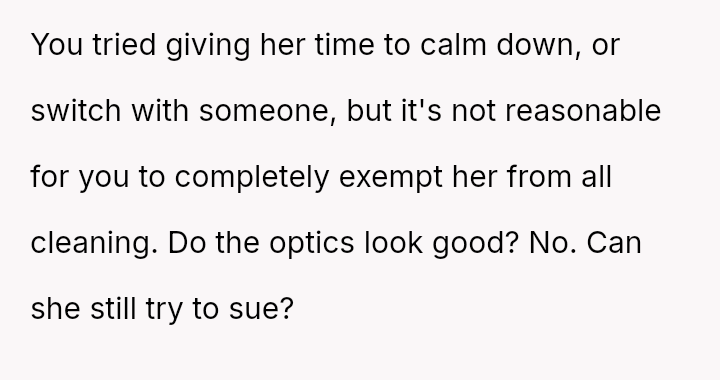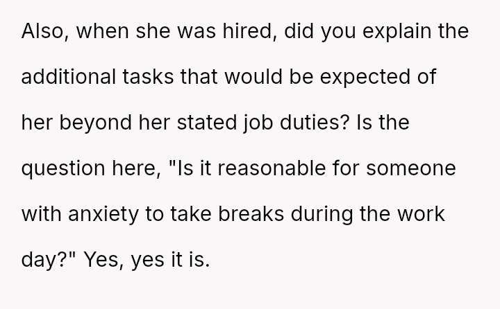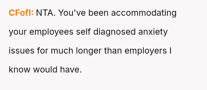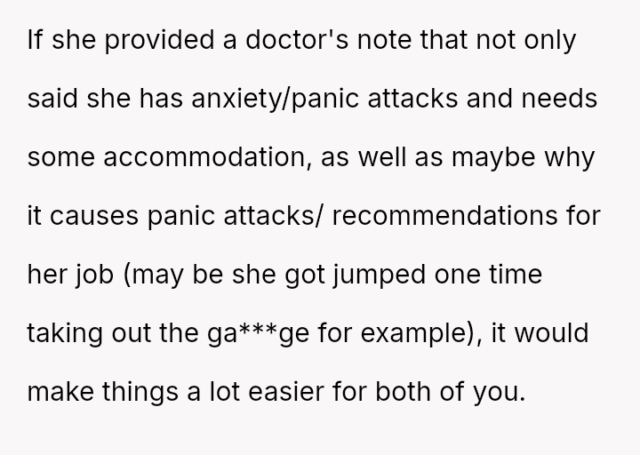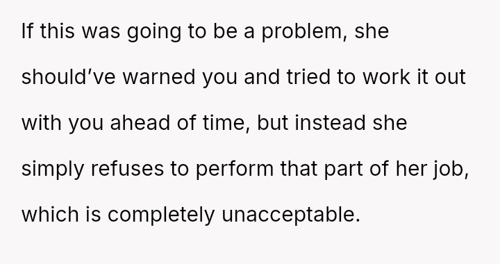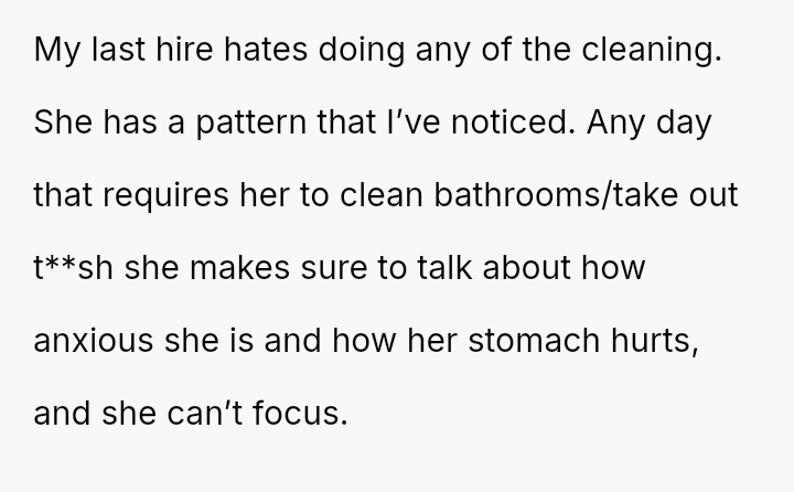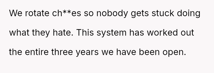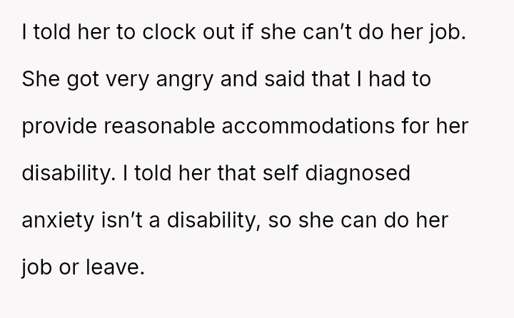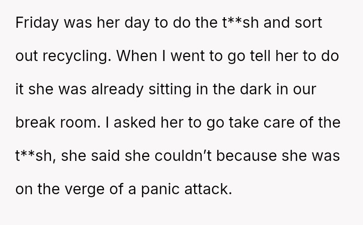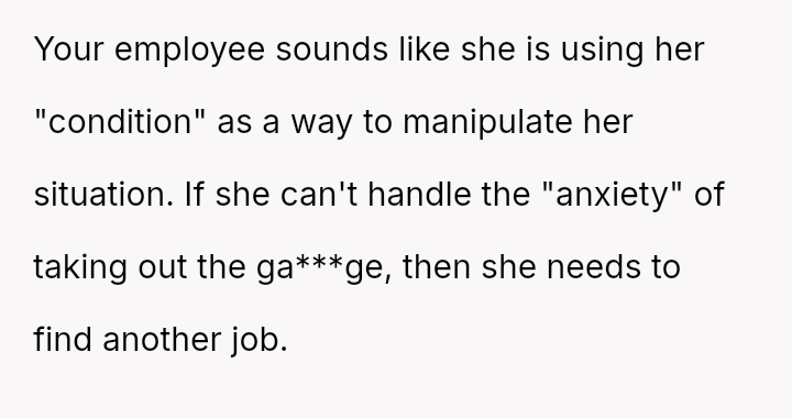 The business owner experienced a direct conflict when an employee refused to complete a rotating ch**e, claiming anxiety prevented her from taking out the t**sh.