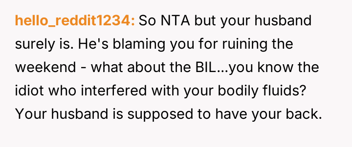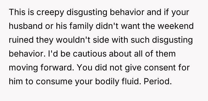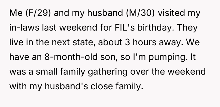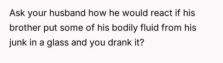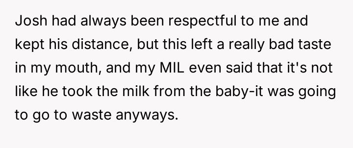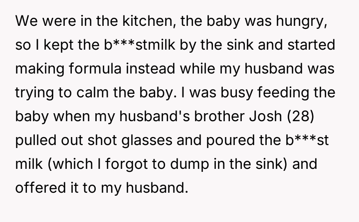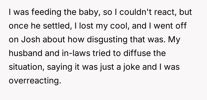 The original poster experienced intense feelings of disgust and anger when her brother-in-law used her expressed b***st milk as a joke during a family gathering, which was then dismissed by her husband and in-laws.