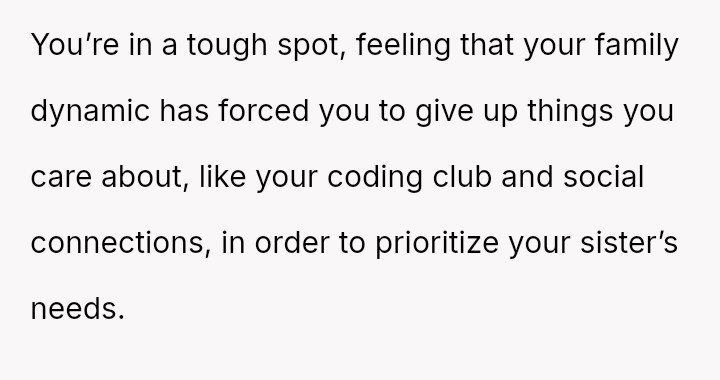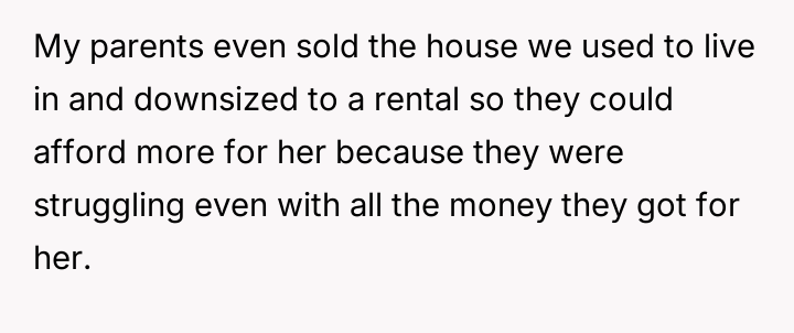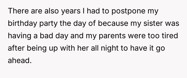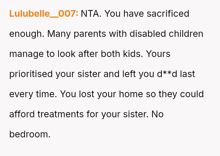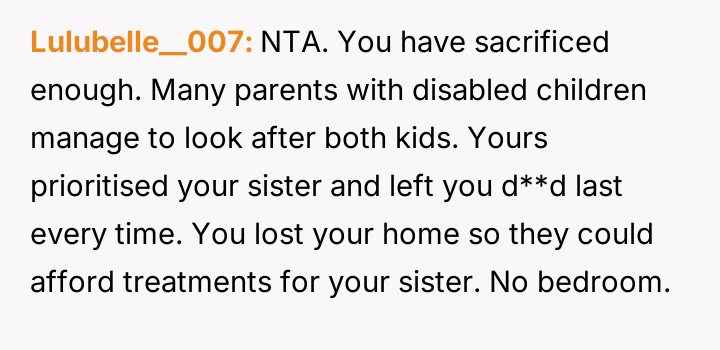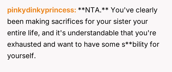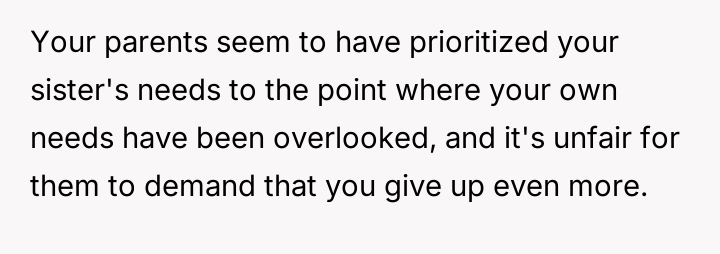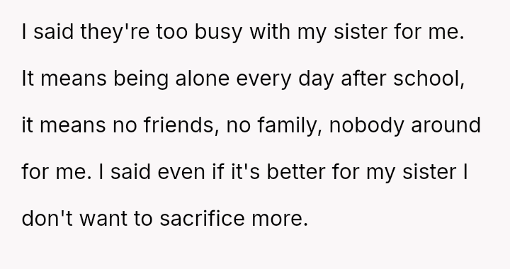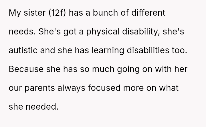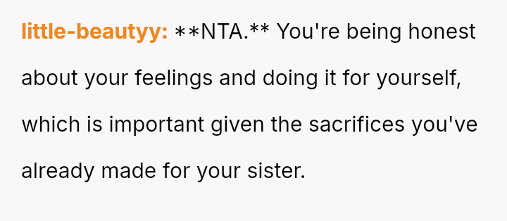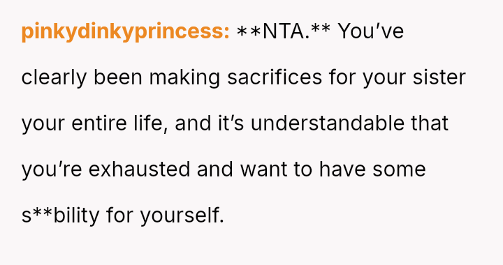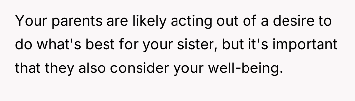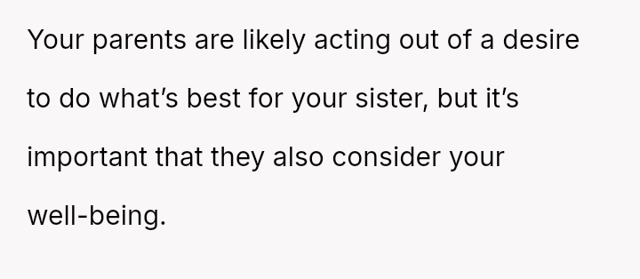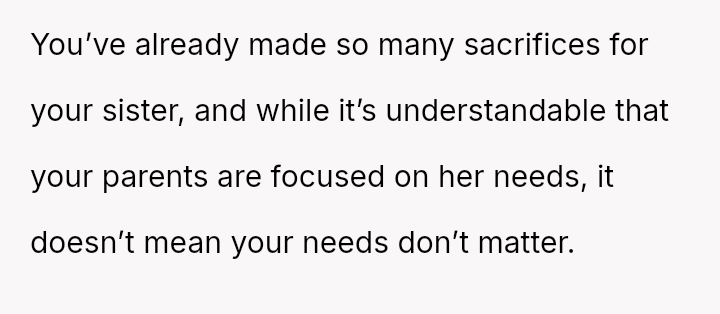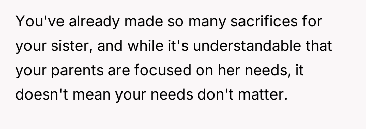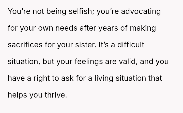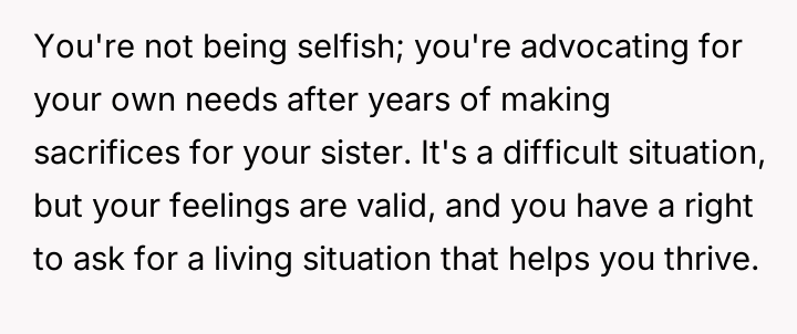 The original poster (OP) feels consistently overlooked and burdened by the immense needs of their younger sister, having made significant personal sacrifices in housing, social life, and opportunities.