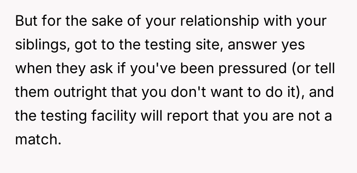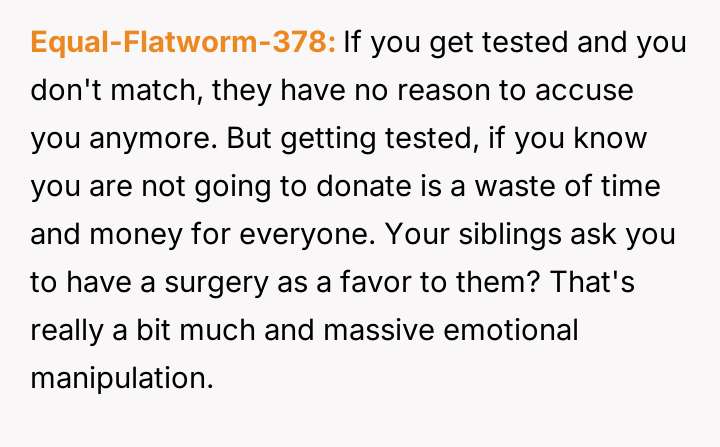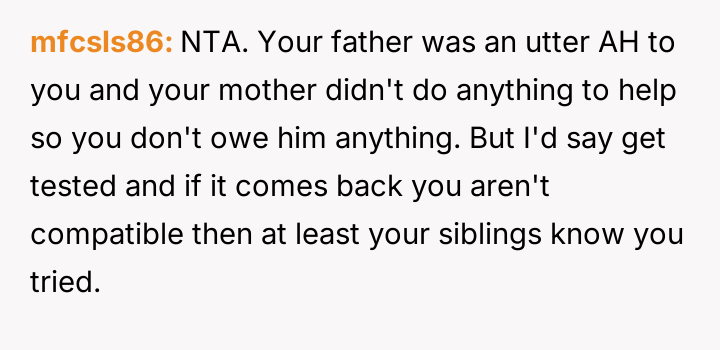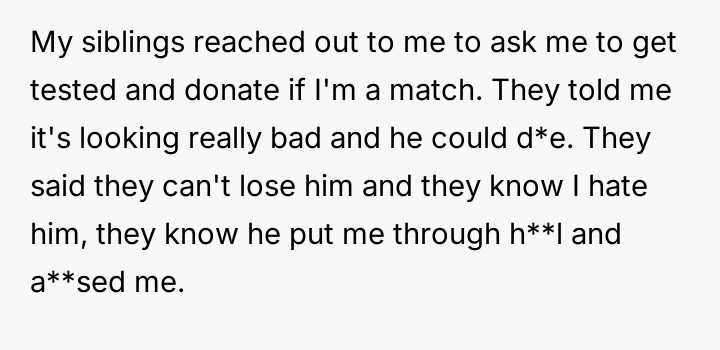 Given the severe, lifelong a**se inflicted by the father, is the OP morally obligated, even implicitly, to undergo medical testing for a transplant to satisfy the emotional needs of their siblings, or does the right to self-preservation and freedom from past a**sers supersede all familial obligation in this medical context?