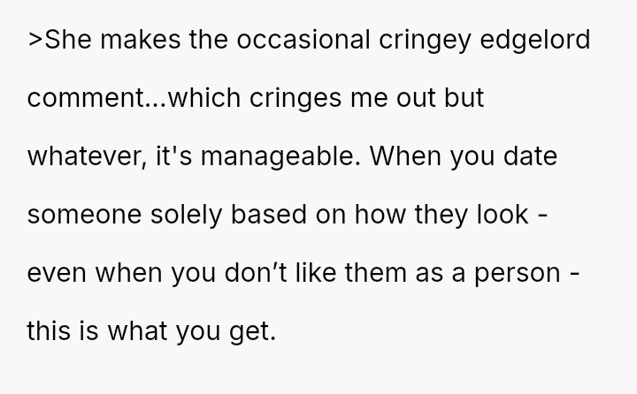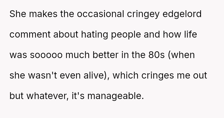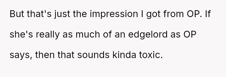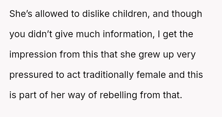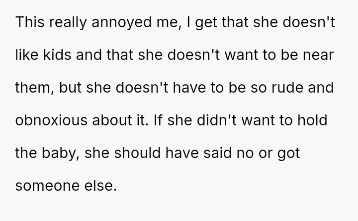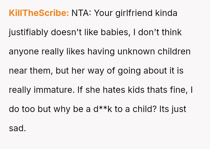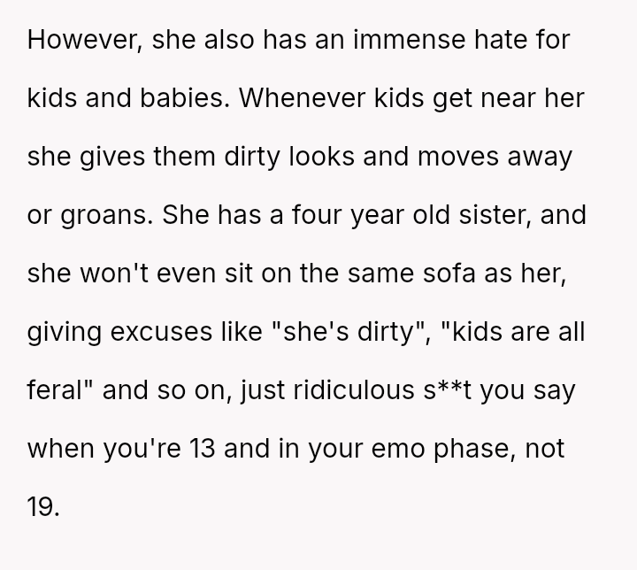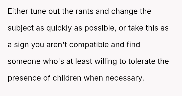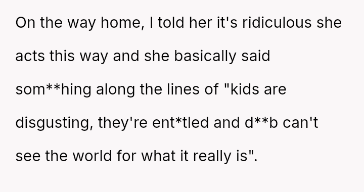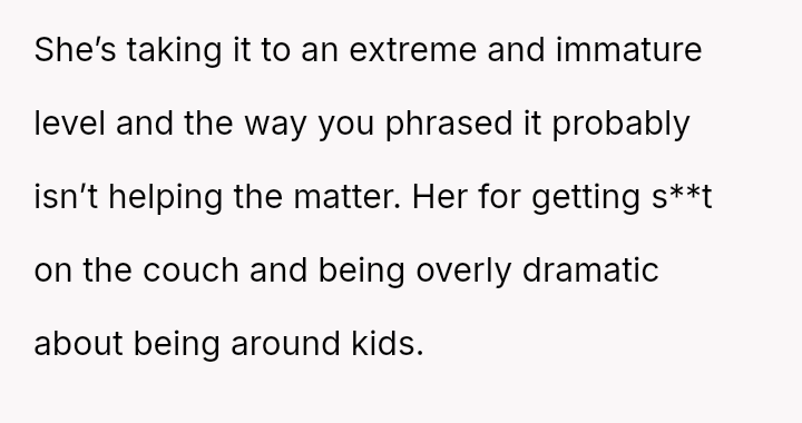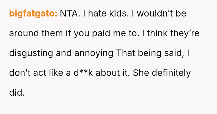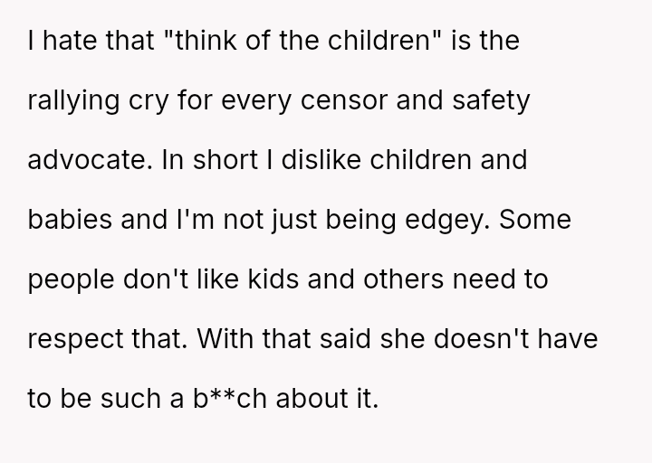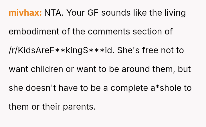 The OP feels his girlfriend acts inappropriately rude and immature regarding children, while she maintains that her extreme dislike is justified by her perception of children as generally 'disgusting' and 'ent*tled.' The central question is whether the girlfriend's intense aversion to children justifies her overtly rude behavior in social settings, particularly around family, or if the OP is right to insist that basic courtesy and boundary setting should override her need to express her 'edgy' disdain for minors.