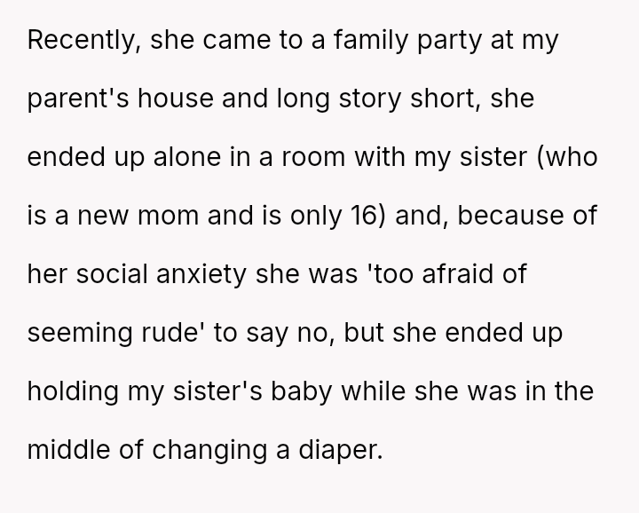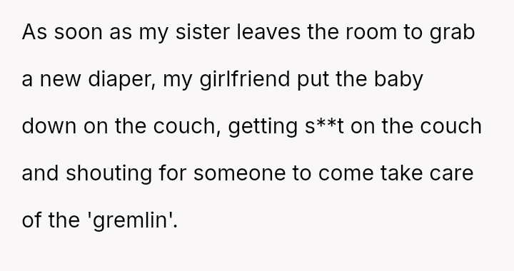 The Original Poster (OP) is experiencing significant conflict because his girlfriend's strong, negative att*tude toward children clashes with the reality of being around family, especially his young sister who is a new mother.