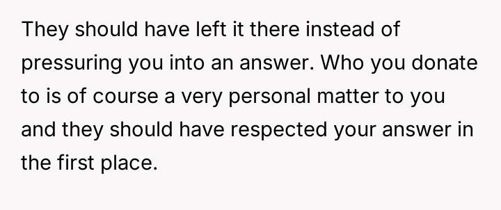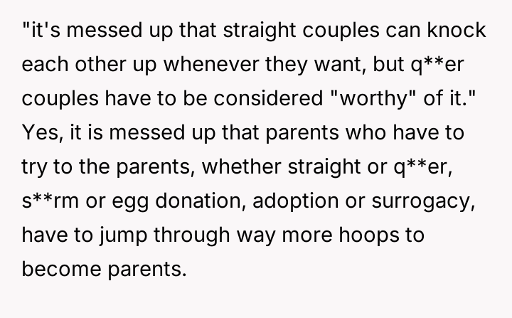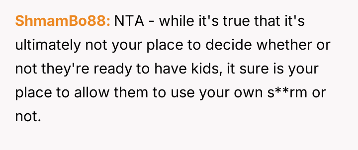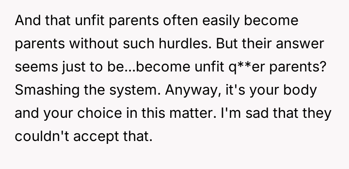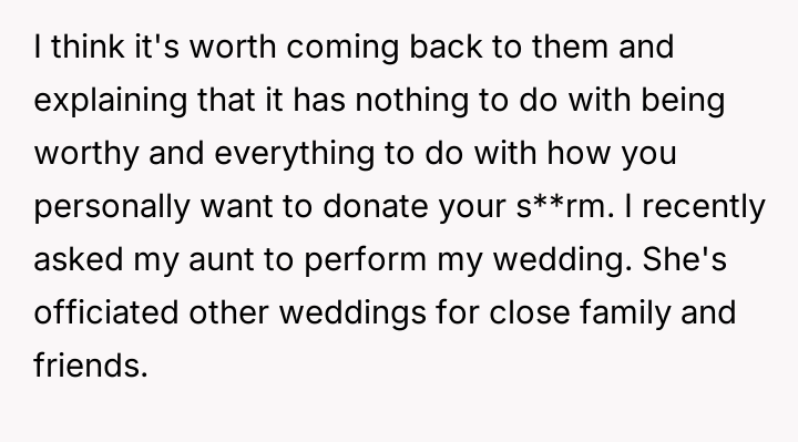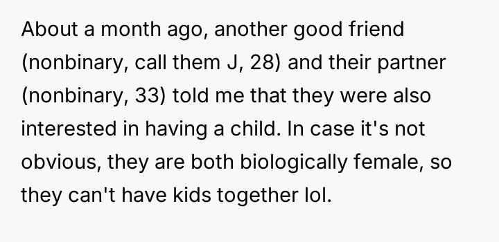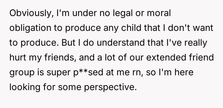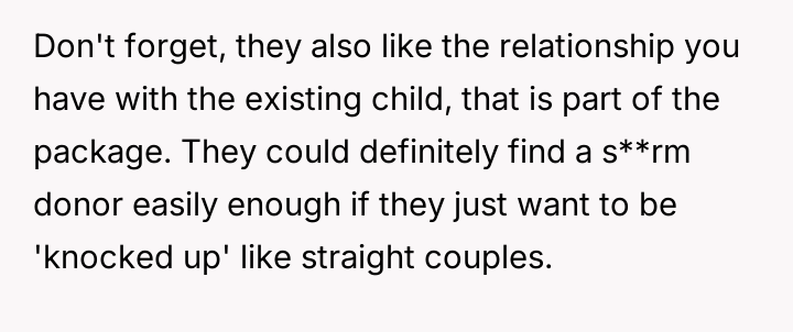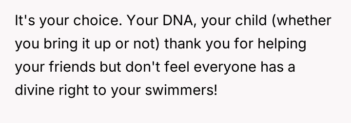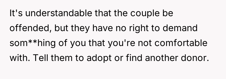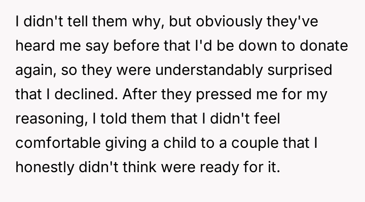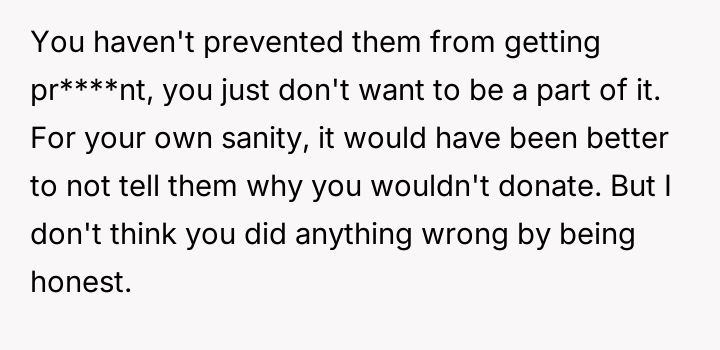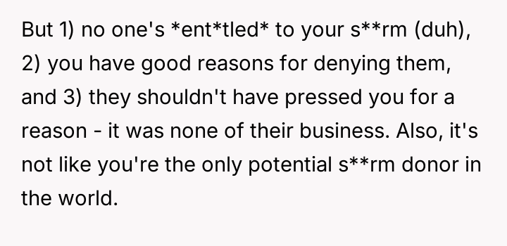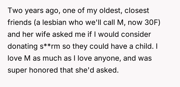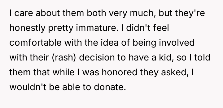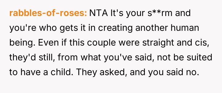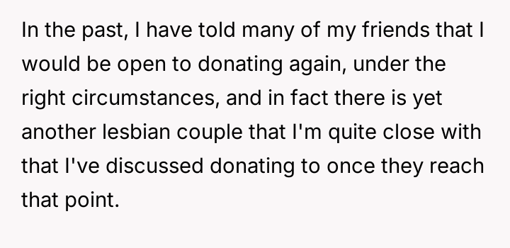 Given that the OP has already es**blished a pattern of willingness to donate to other trusted q**er friends, the central question becomes: Does a person who volunteers to be a known donor retain the right to exercise personal judgment regarding the s**bility and fitness of the intended parents, even when exercising that judgment causes deep hurt and social backlash?
