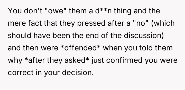 While the OP felt honored by the request, their decision to decline, based on concerns about the friends' relationship ins**bility, caused significant offense and tension within their social circle.