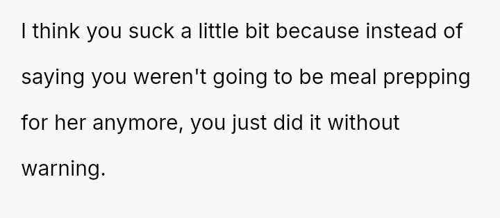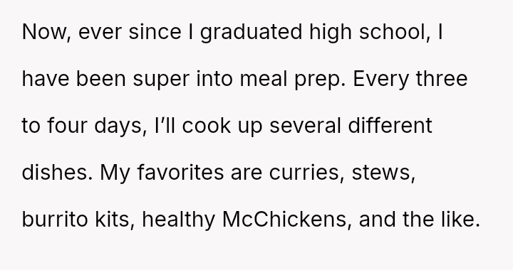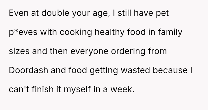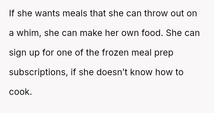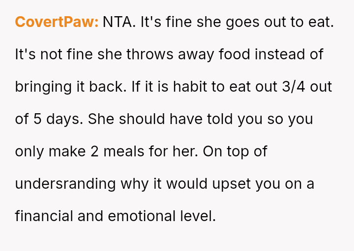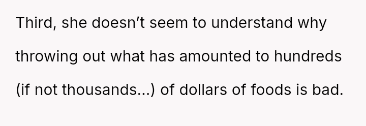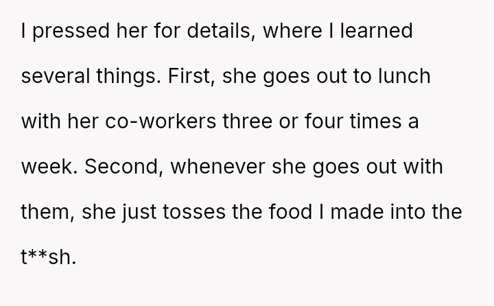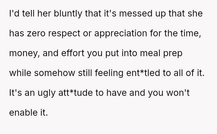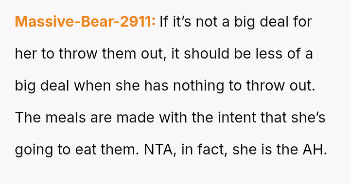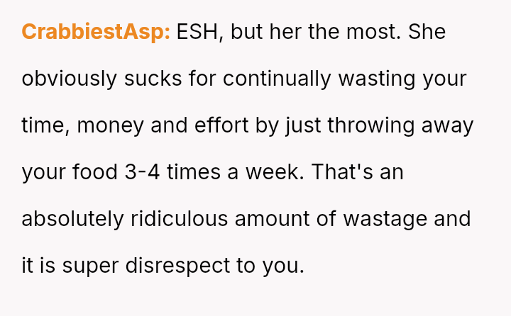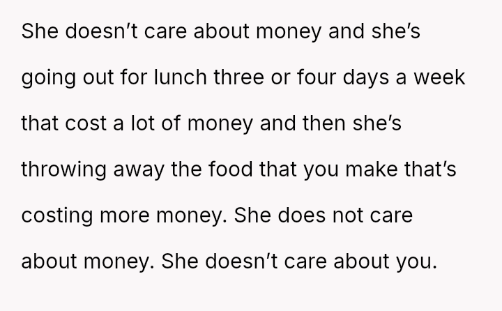 The original poster feels deeply disrespected and financially taken advantage of because his wife consistently discards the substantial effort and money he invests in meal prepping for her.