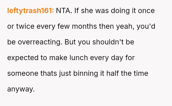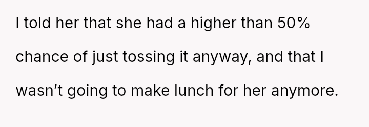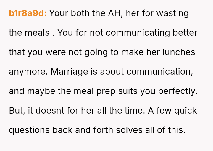 Is the husband justified in unilaterally stopping his meal preparation as a boundary against his wife's wasteful behavior, or was this action an overly harsh and disproportionate response to a communication failure regarding packed lunches?