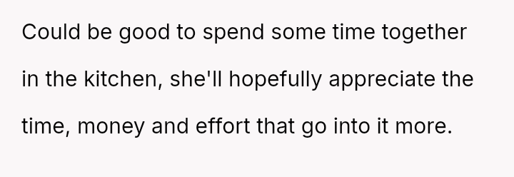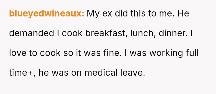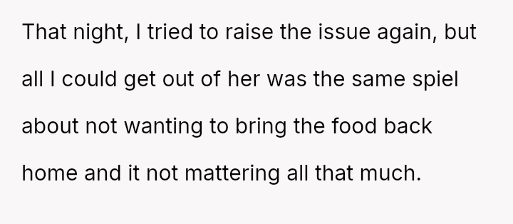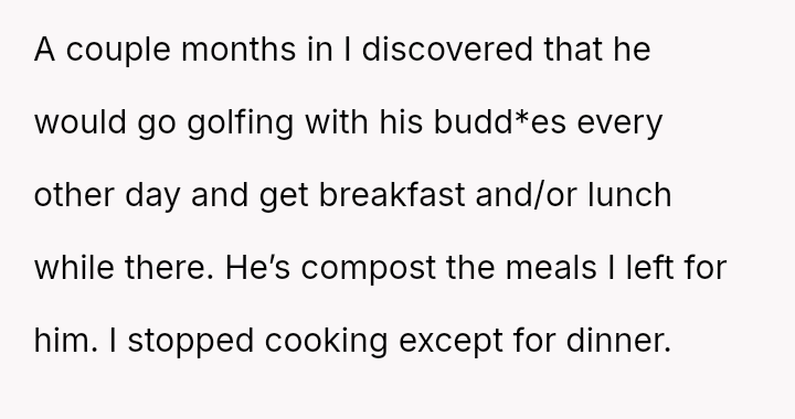 His reaction was to immediately cease preparing food for her, creating a direct confrontation regarding her disregard for his efforts and their shared resources.