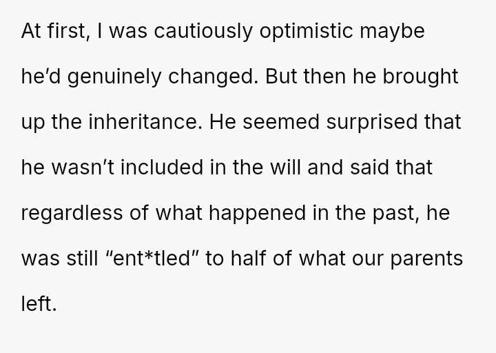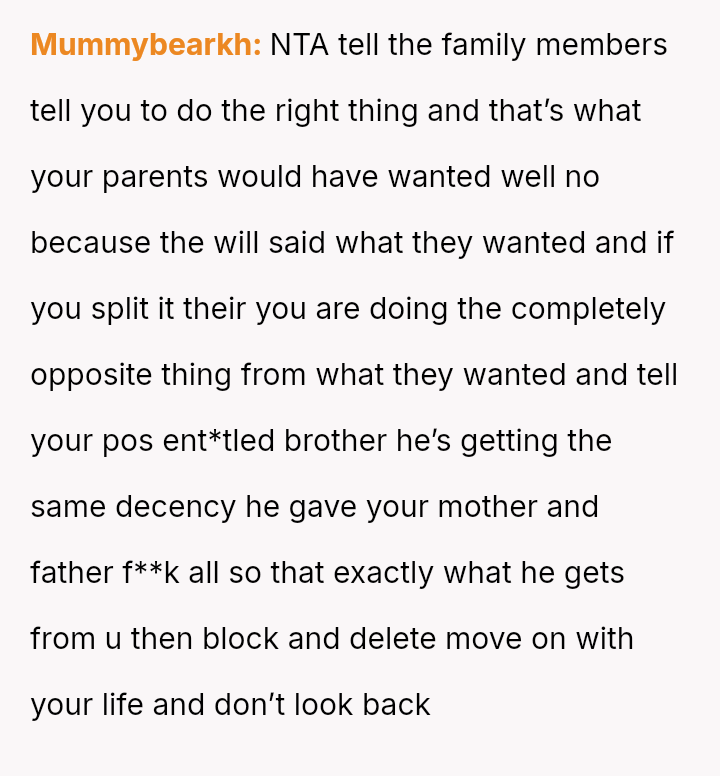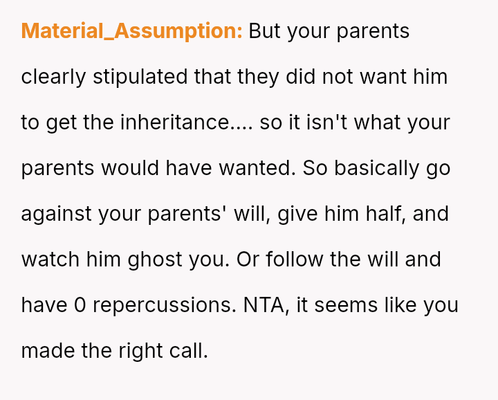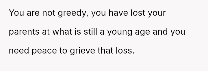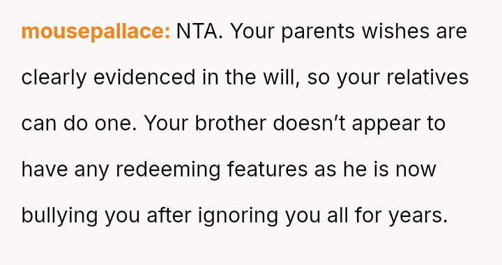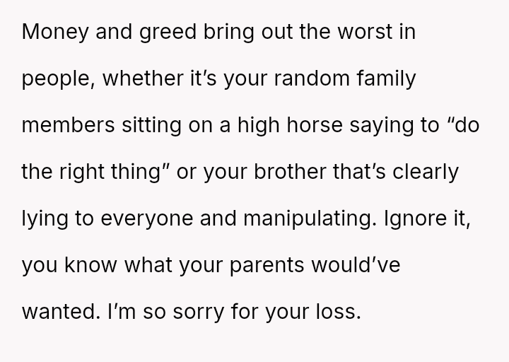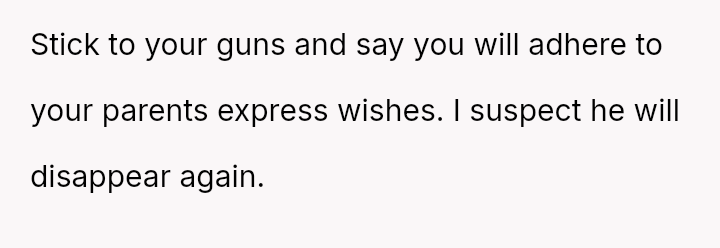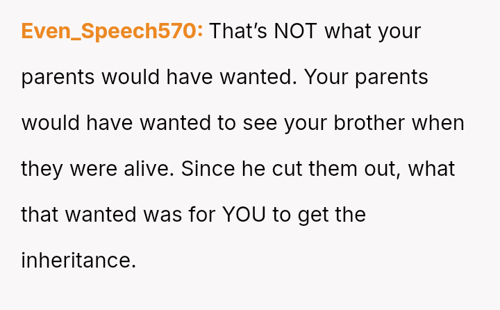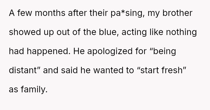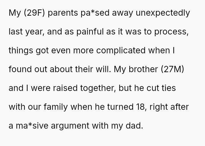 The Original Poster (OP) is facing a difficult situation where grief over her parents' death is compounded by her estranged brother suddenly reappearing solely to claim an inheritance.