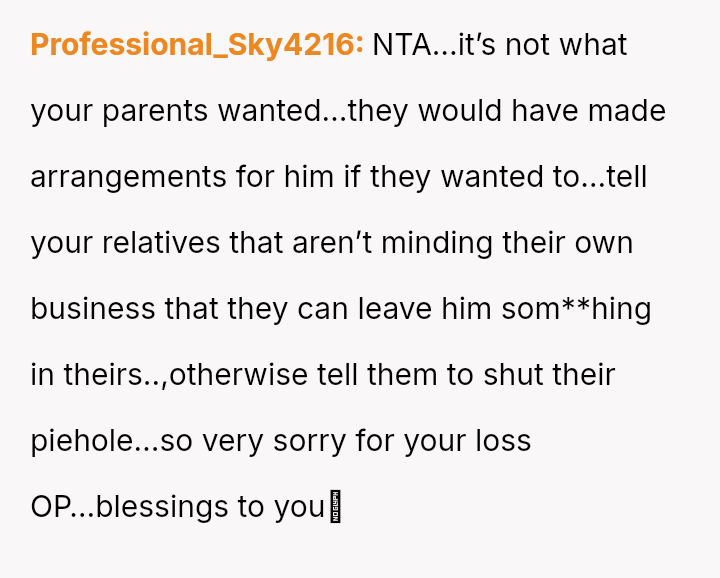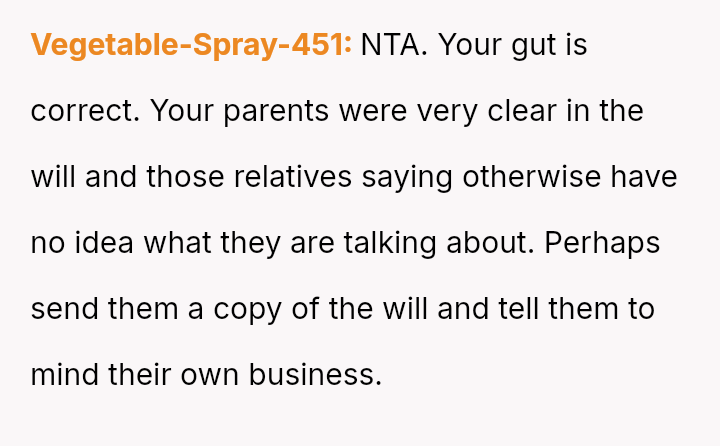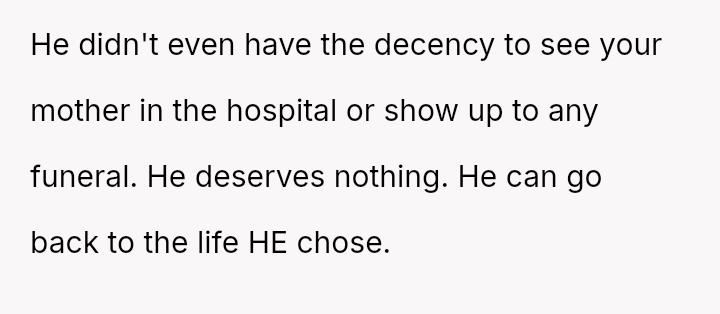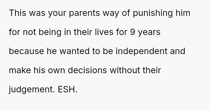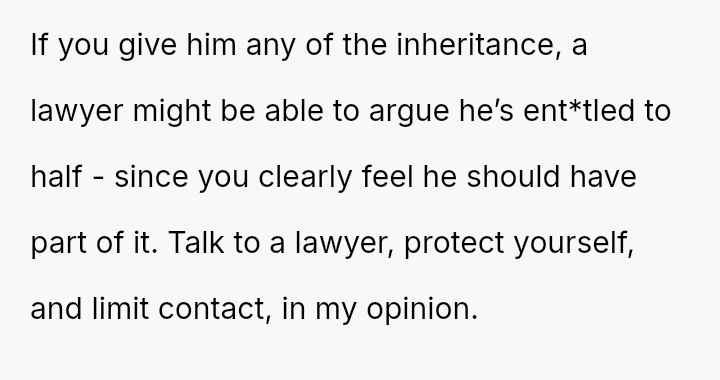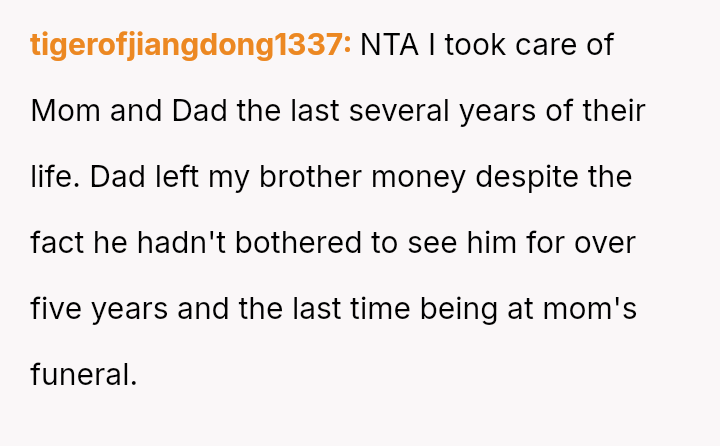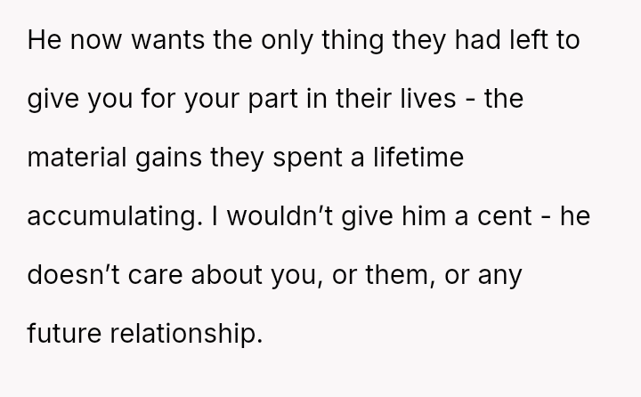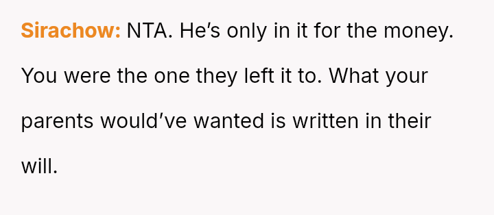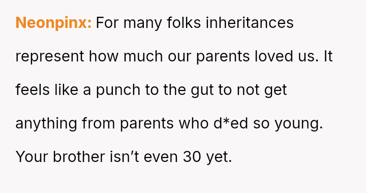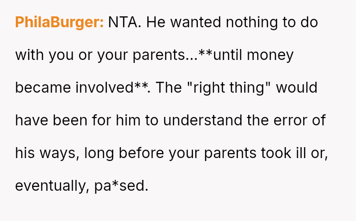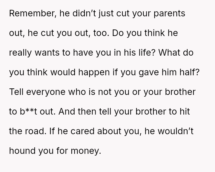 The Original Poster (OP) is facing a difficult situation where grief over her parents' death is compounded by her estranged brother suddenly reappearing solely to claim an inheritance.