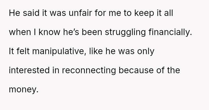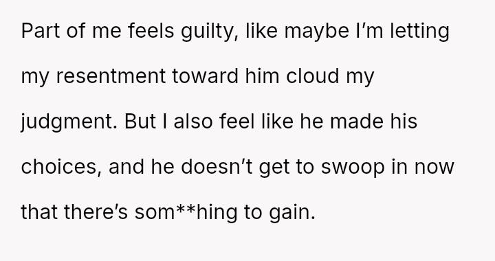Her core conflict lies between honoring her parents' explicit wishes, which excluded him due to his abandonment, and the emotional pressure from family members suggesting she should share the a*sets based on a generalized idea of what 'family' should do.