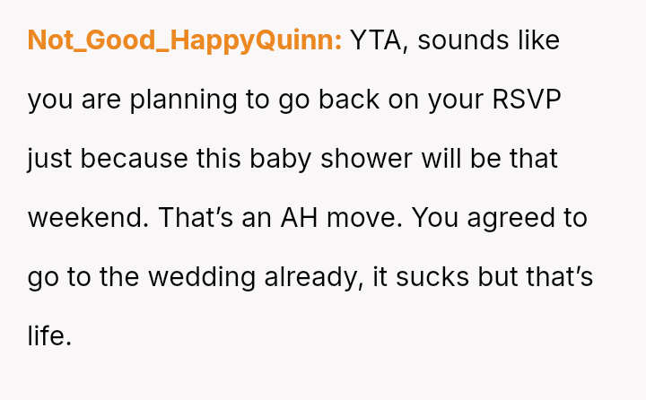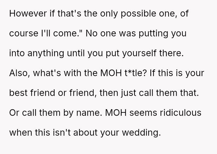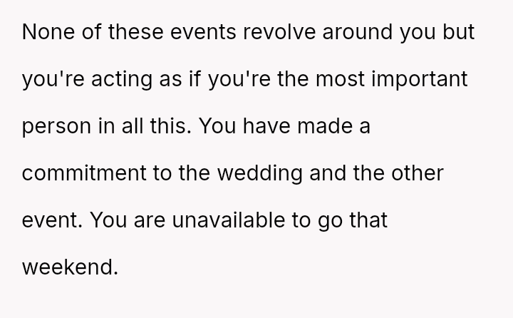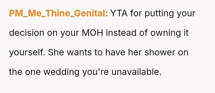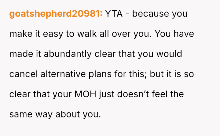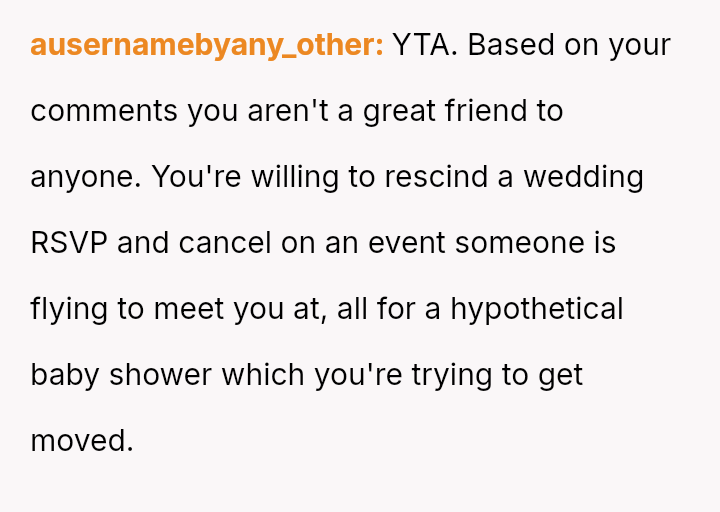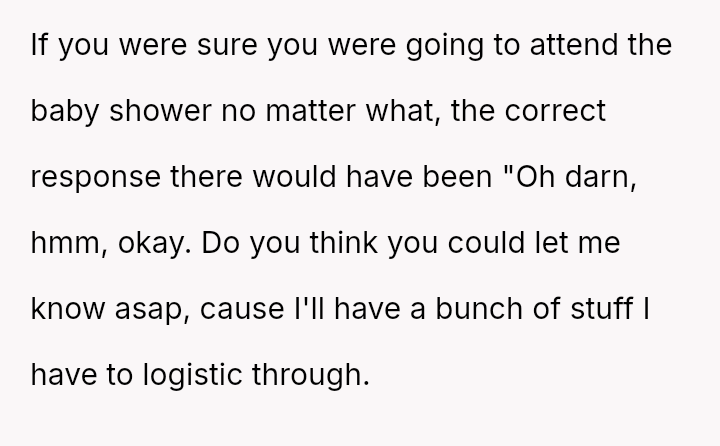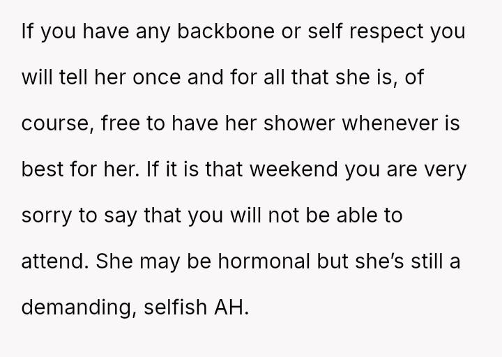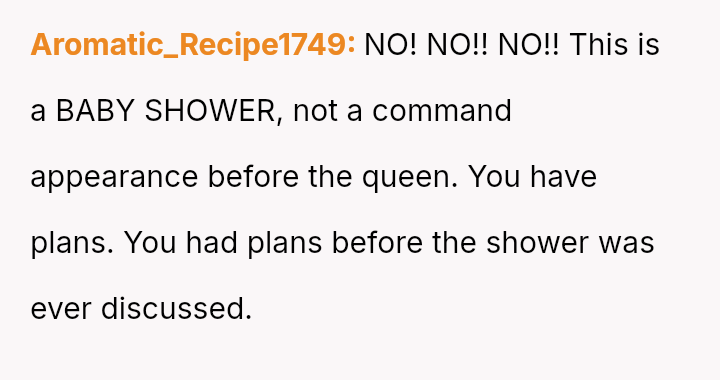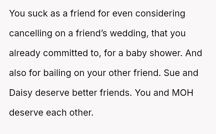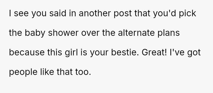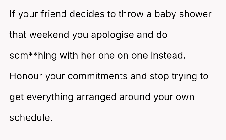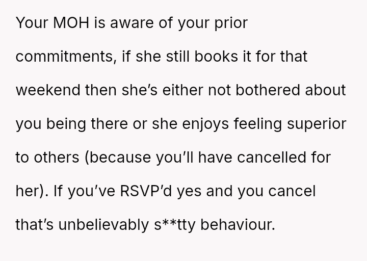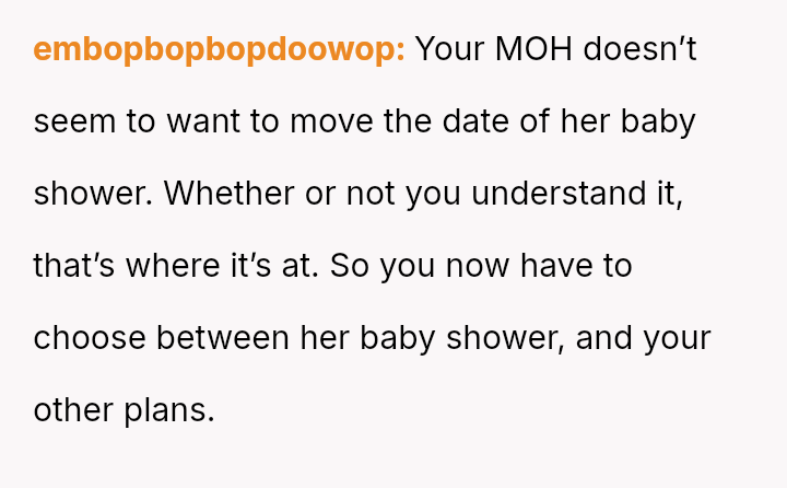 Given the MOH's insistence that her needs supersede the OP's existing plans, the core question remains: Is it reasonable to expect a close friend, especially one traveling for a major event, to cancel two pre-arranged, significant commitments for a baby shower, even when acknowledging the friend's pregnancy excitement and hormonal state?