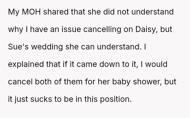 The Original Poster (OP) is deeply conflicted, feeling hurt and unappreciated because their Maid of Honor (MOH) is insisting on scheduling her baby shower on a date that forces the OP to cancel two significant prior commitments involving travel and other friends' major life events (a wedding and another planned trip).