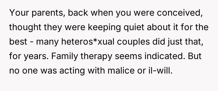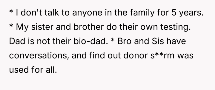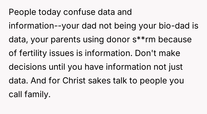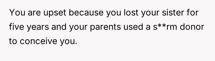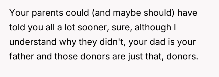 The original poster (OP) is dealing with complex emotions stemming from the revelation that they and their siblings are donor-conceived, a truth previously hidden by their parents.