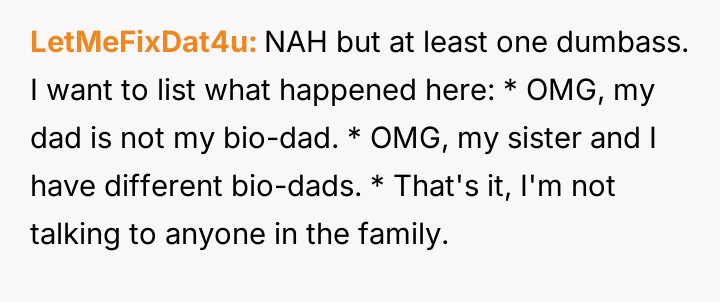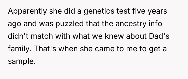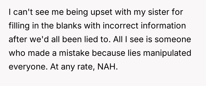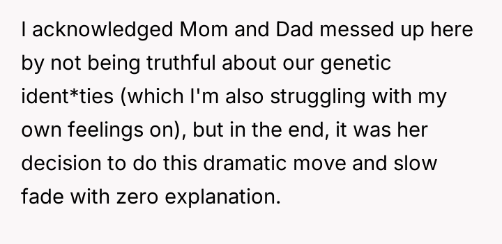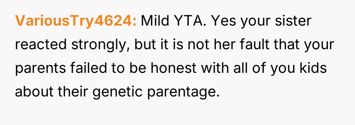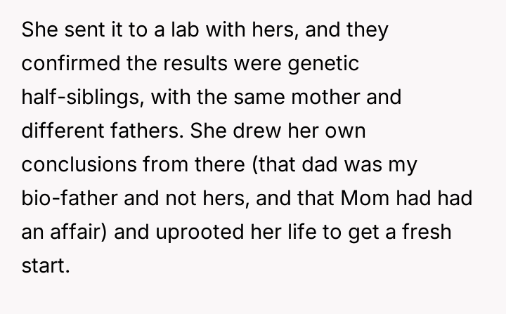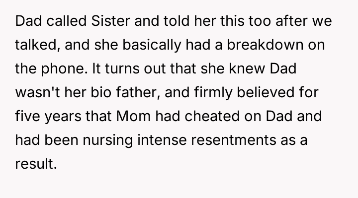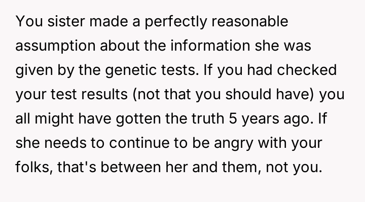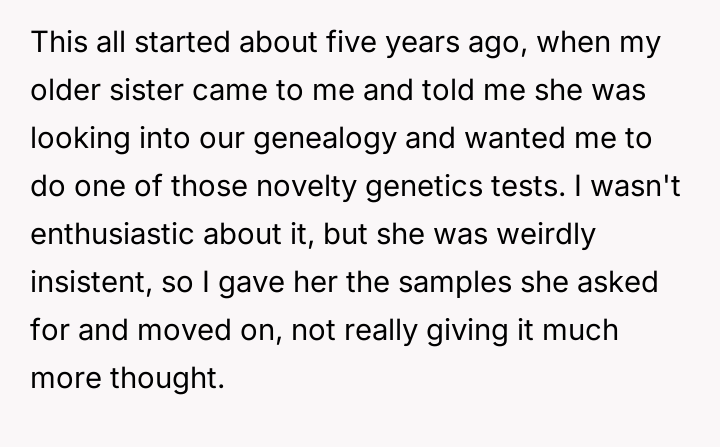 The central conflict arises because the older sister, having discovered this information years earlier through independent testing and misinterpreted results, chose to silently distance herself from the entire family without explanation, leading to significant emotional damage and resentment among the siblings.