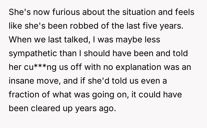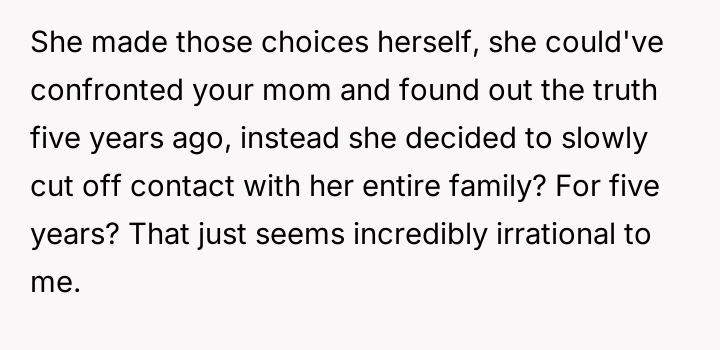 Given the sister's decision to self-isolate based on incomplete and incorrect assumptions, was the OP justified in confronting her about the damage done by her actions, or should the OP have approached the situation with more patience given the sister's five-year period of private suffering and misunderstanding?