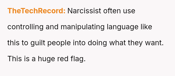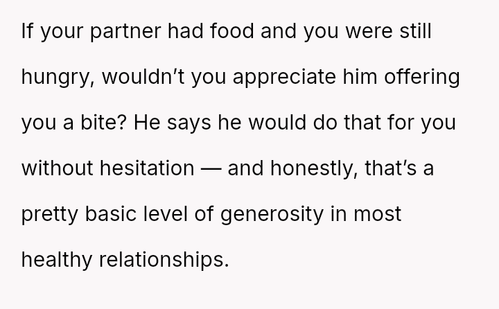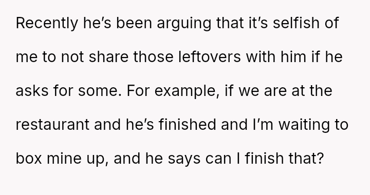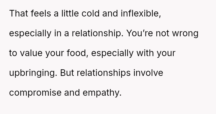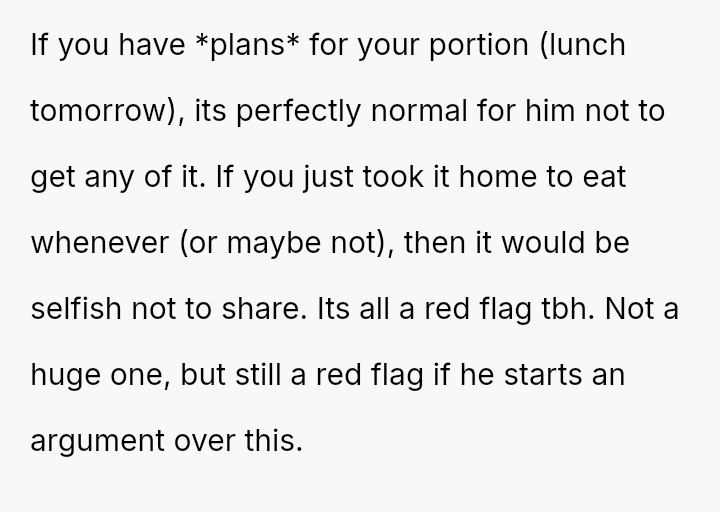 She views her planned leftovers as her property for future meals, while her boyfriend perceives her refusal to share them as selfish, expecting immediate generosity based on his upbringing.
