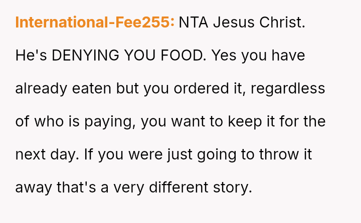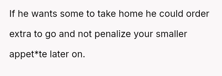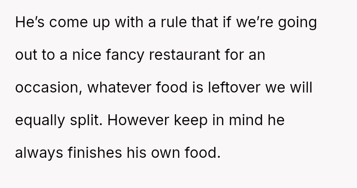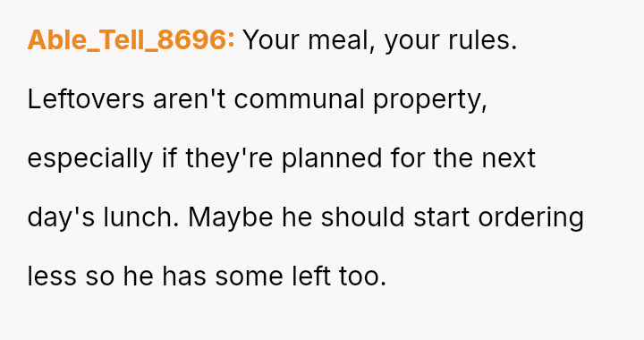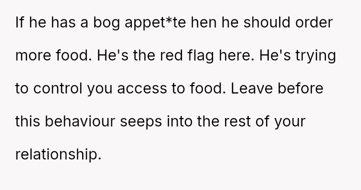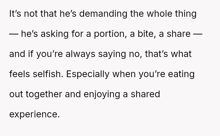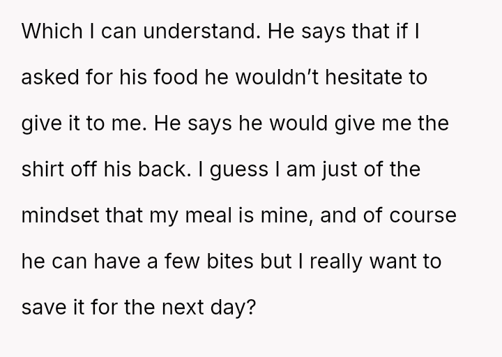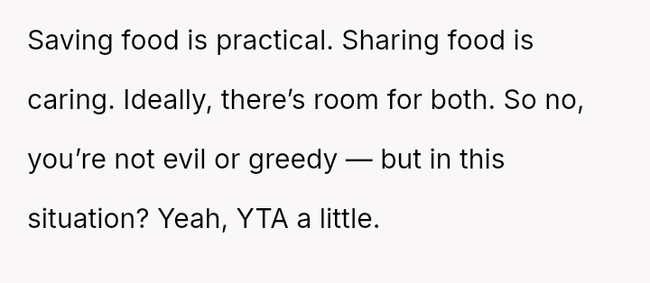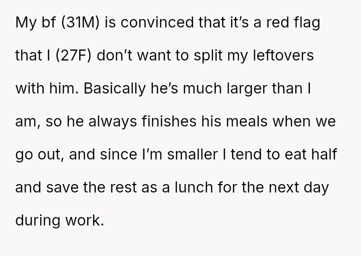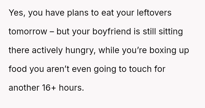 Given the OP's deep-seated need to save food for later versus the boyfriend's expectation of immediate sharing, is the OP's boundary regarding her planned leftovers selfish, or is the boyfriend imposing an unreasonable expectation on her personal resources?