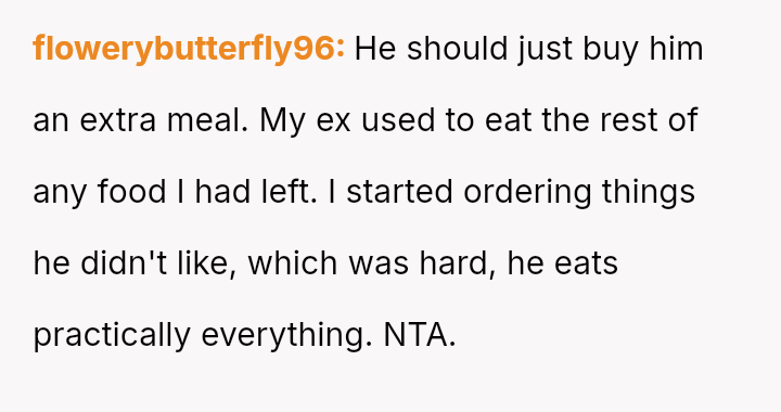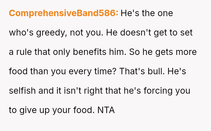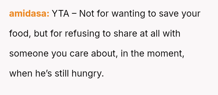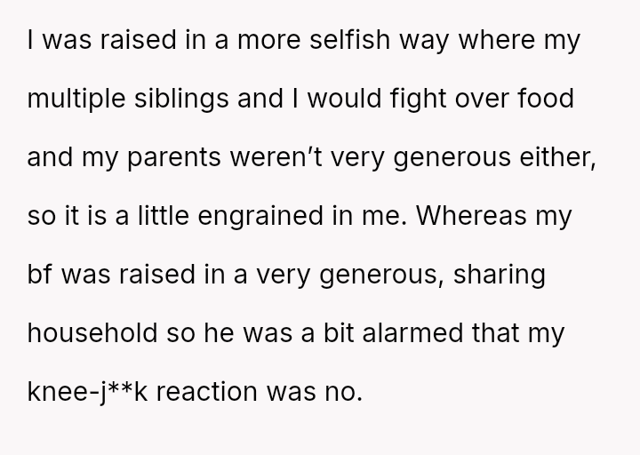 The original poster is facing a conflict rooted in differing values regarding food sharing, stemming from contrasting childhood environments.