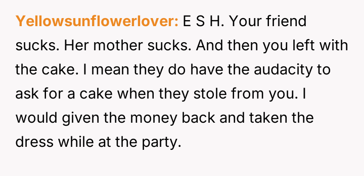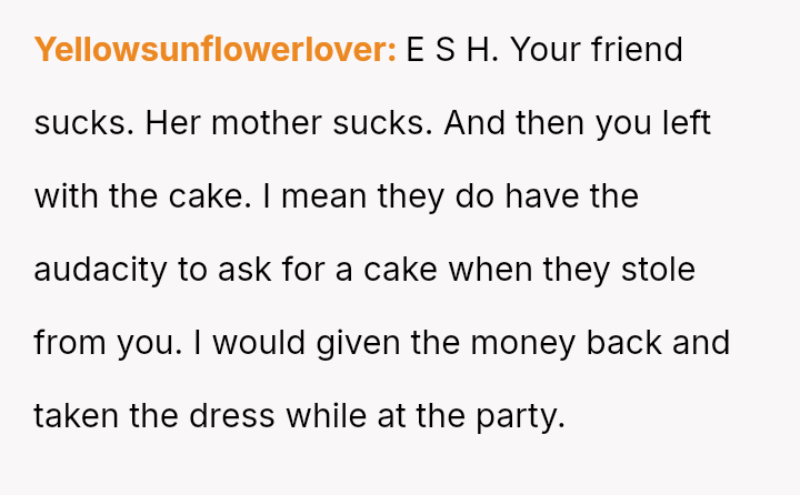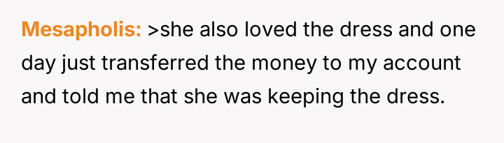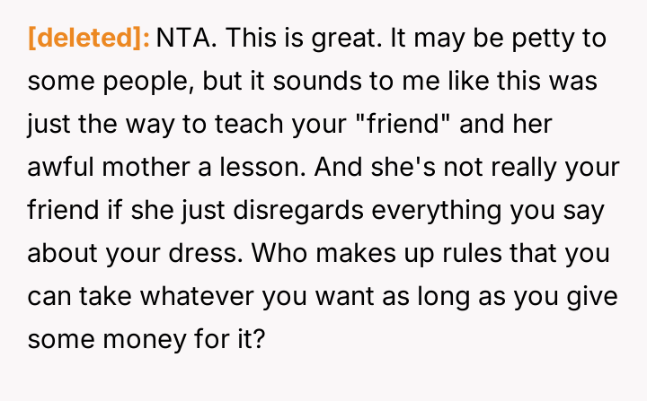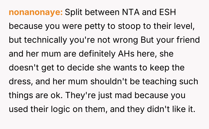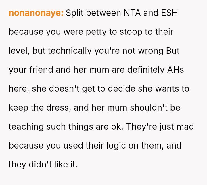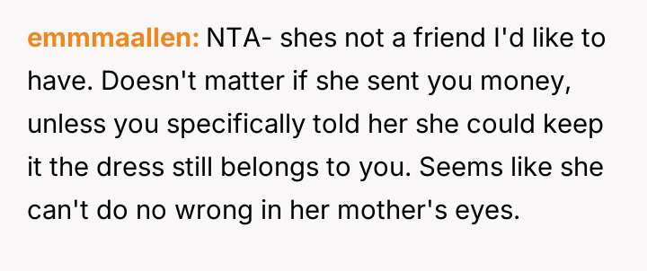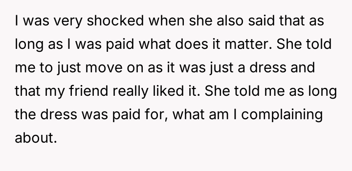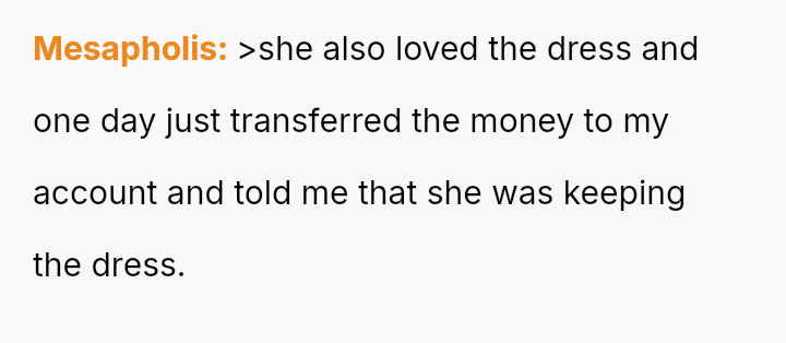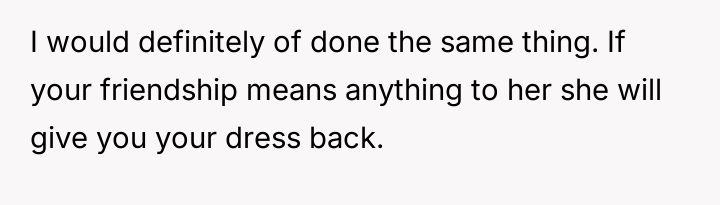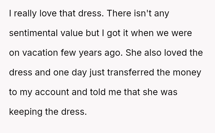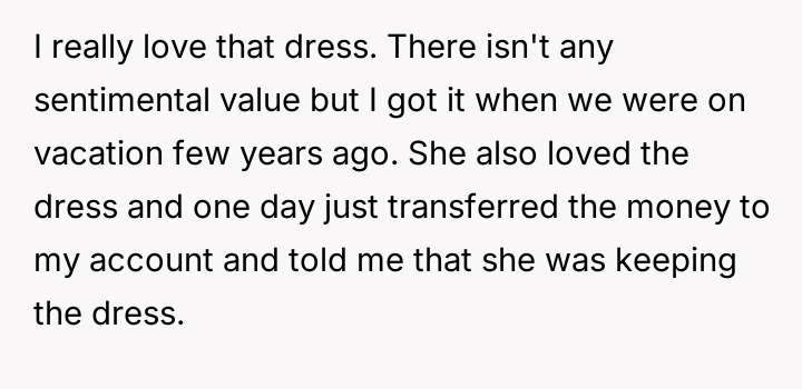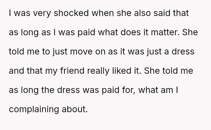 The original poster (OP) felt intense frustration when both their friend and the friend's mother dismissed their emotional attachment to a borrowed dress, equating its value solely to the money exchanged for it.