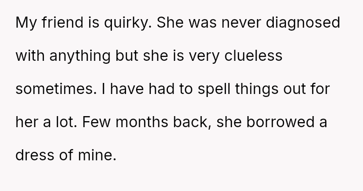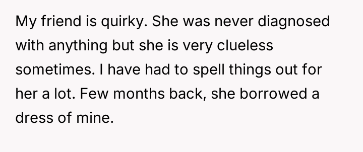 In the quiet corners of friendship, misunderstandings can carve deep wounds. One friend, quirky and often oblivious, crossed an unspoken boundary by keeping a cherished dress without permission, believing payment erased the debt.