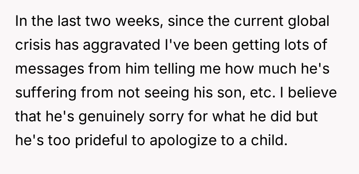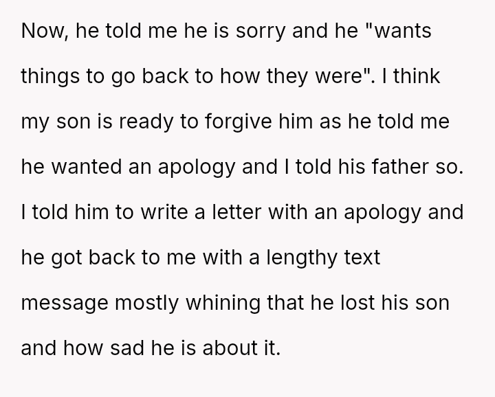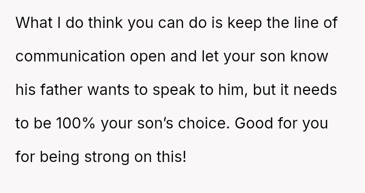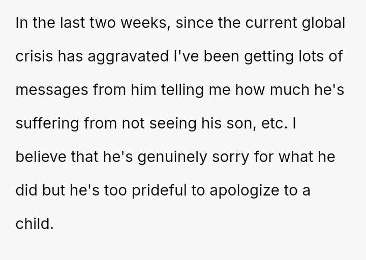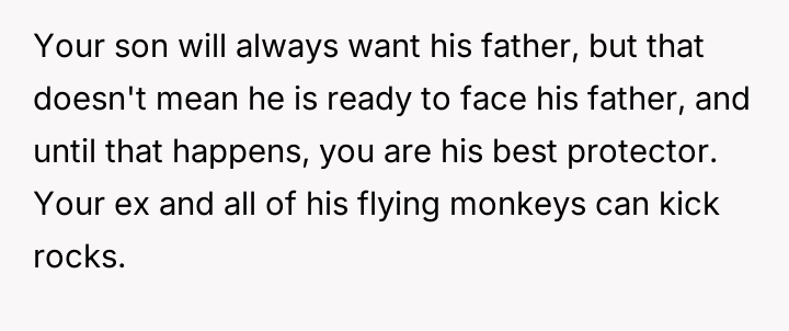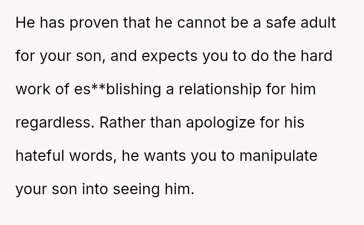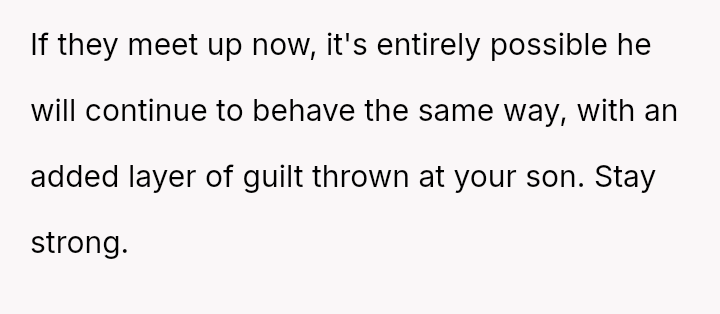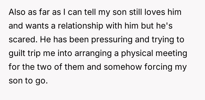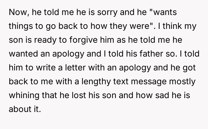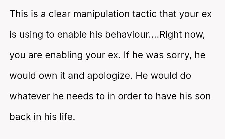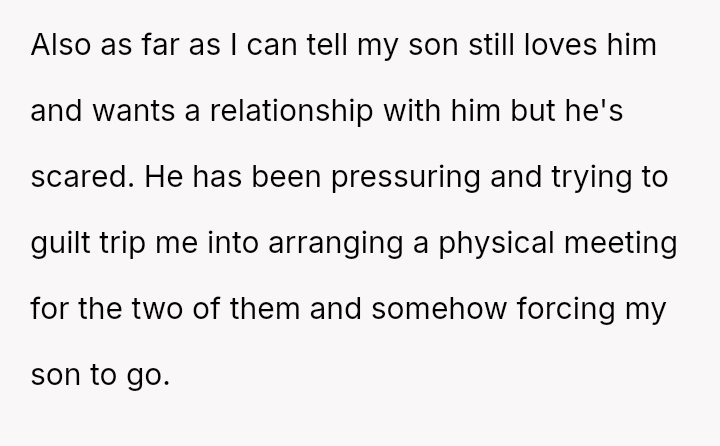 Given that the father has shown no true apology but continues to pressure the OP to deliver the son, should the OP continue to shield their son from contact until the father demonstrates sincere accountability, or does the son's expressed desire to return to normalcy outweigh the immediate risk of renewed emotional pain?