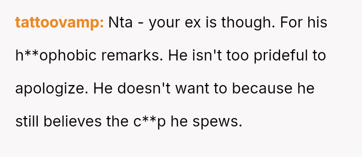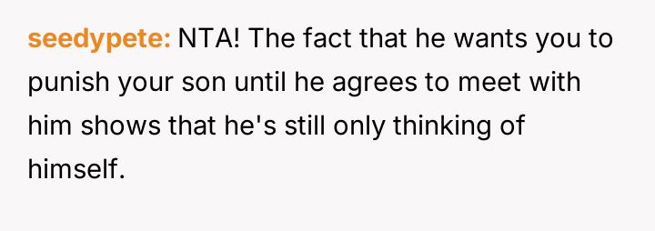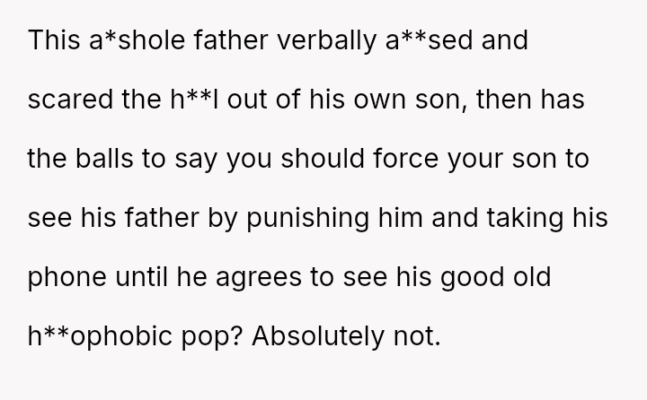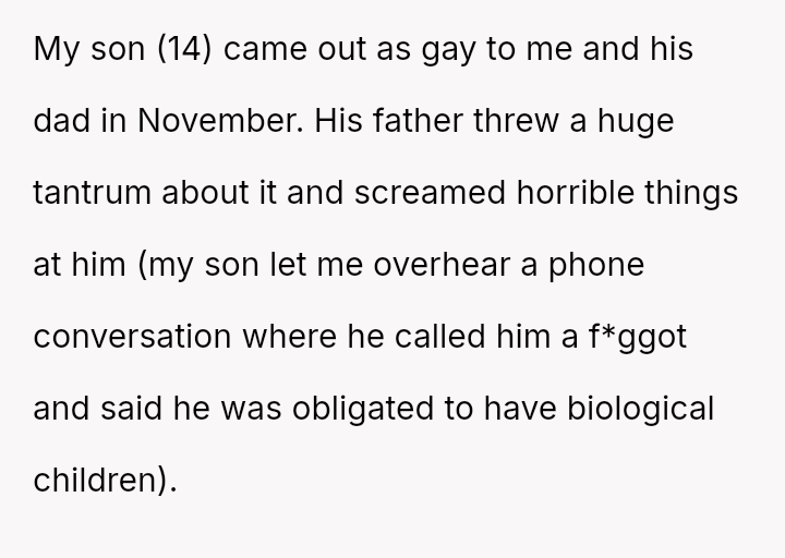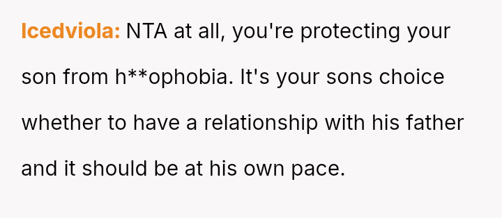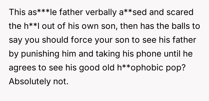 The original poster (OP) is caught between protecting their devastated son from further emotional harm caused by the father's past h**ophobic outburst and the father's current pressure to force a reunion.