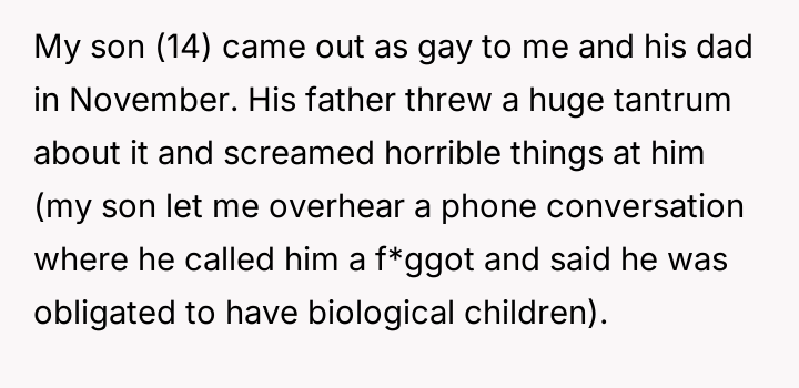 AITA for not sponsoring my son's father's "apology" for how he acted after my son came out?