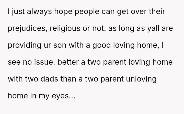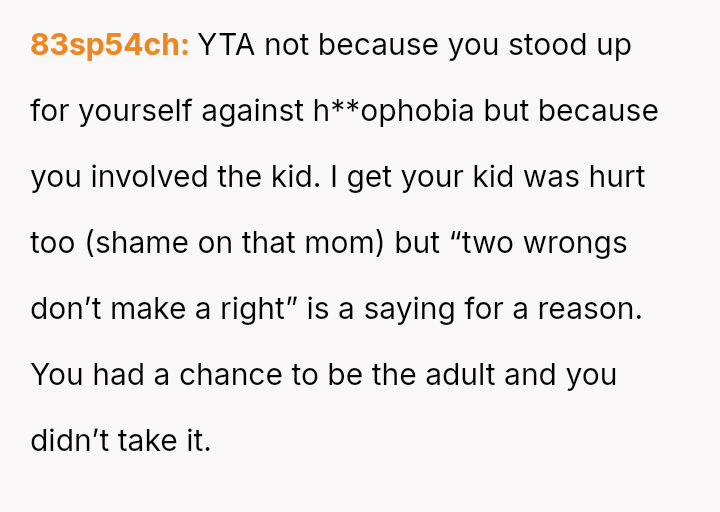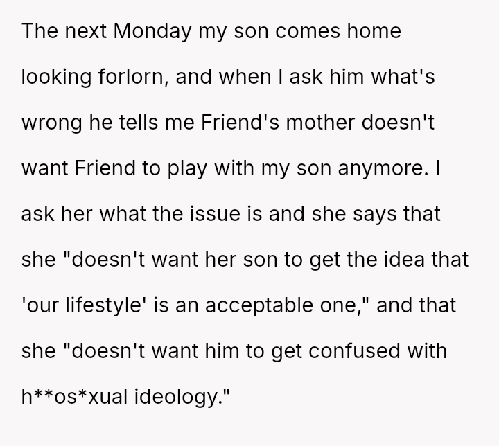 The original poster (OP) found themselves in a difficult situation where a neighbor explicitly ended a play relationship between their children due to prejudice against the OP's same-s*x marriage and family structure.