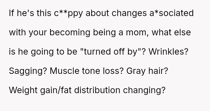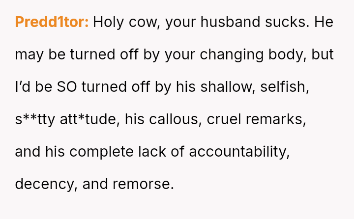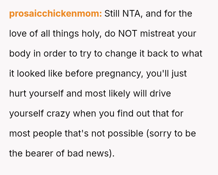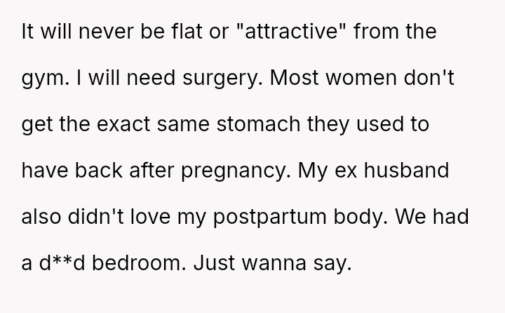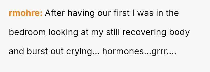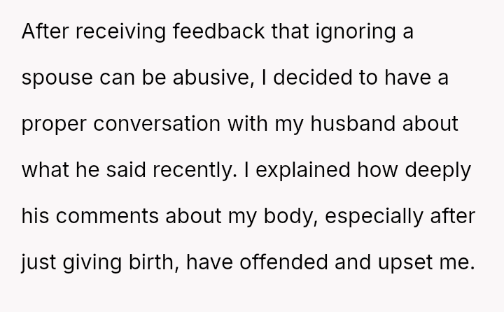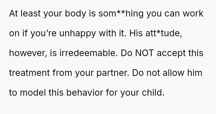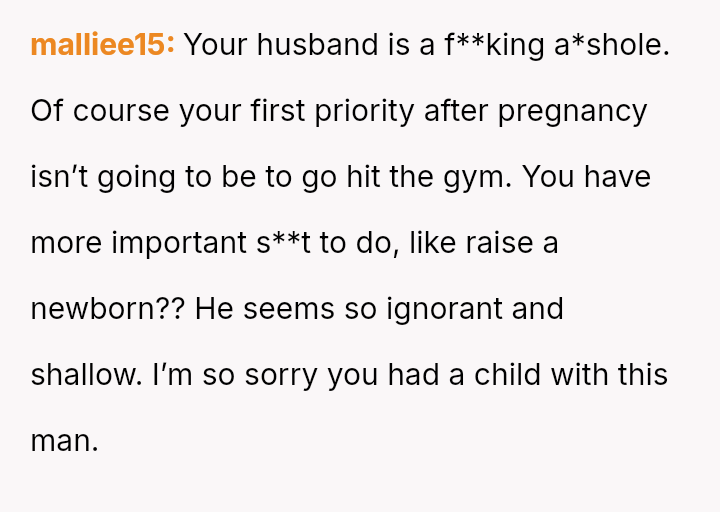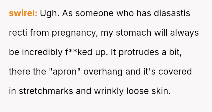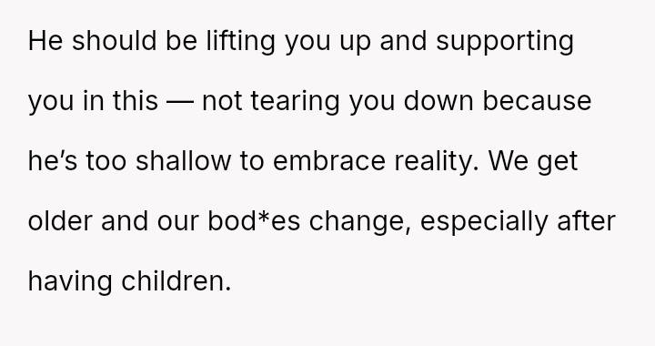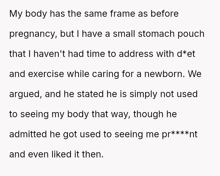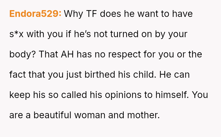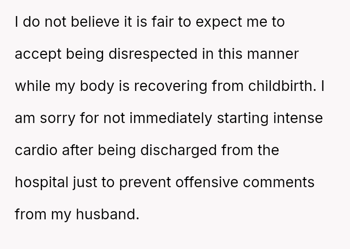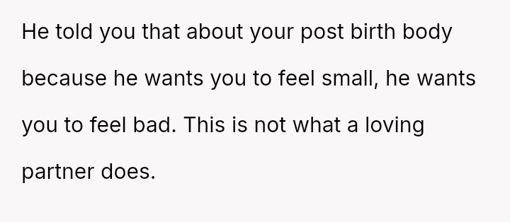 The original poster is deeply hurt and offended by her husband's comments regarding her post-pregnancy body, especially given the physical recovery she is undergoing.