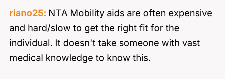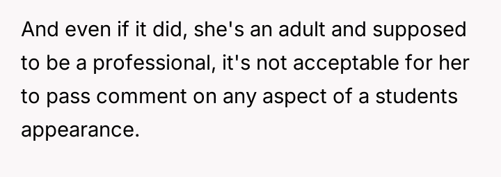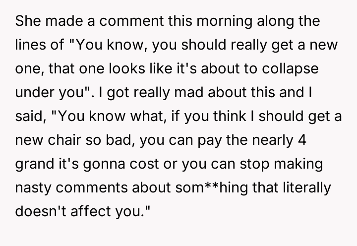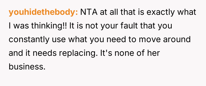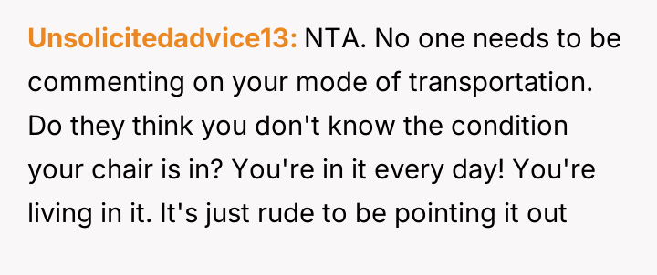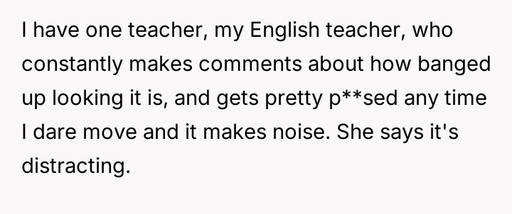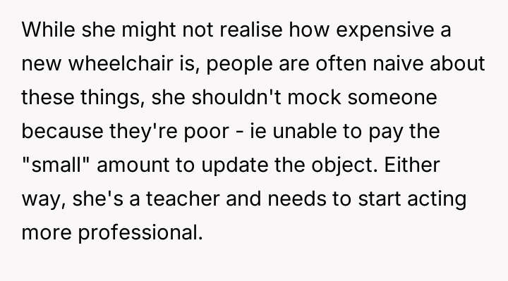The original poster (OP) is facing a conflict stemming from a teacher's repeated, critical comments about her well-used mobility aid, which the OP finds hurtful and intrusive.