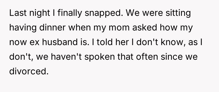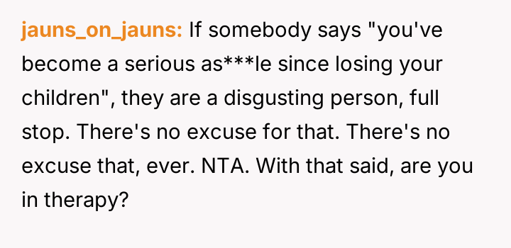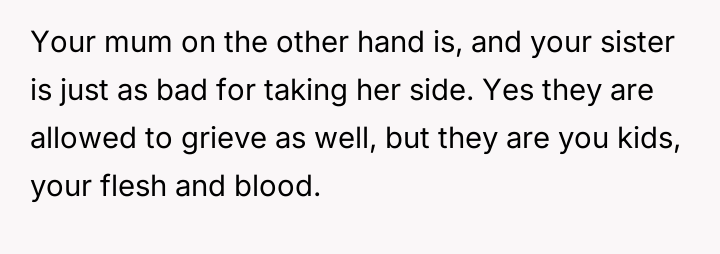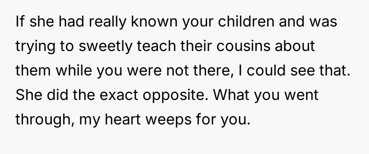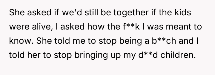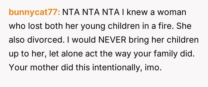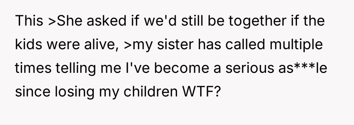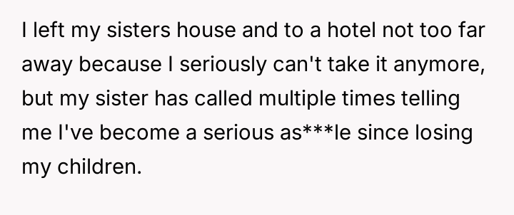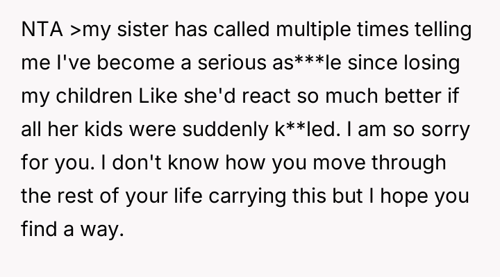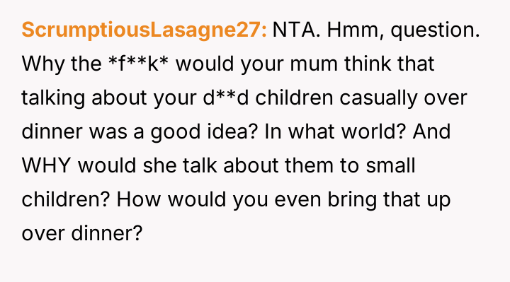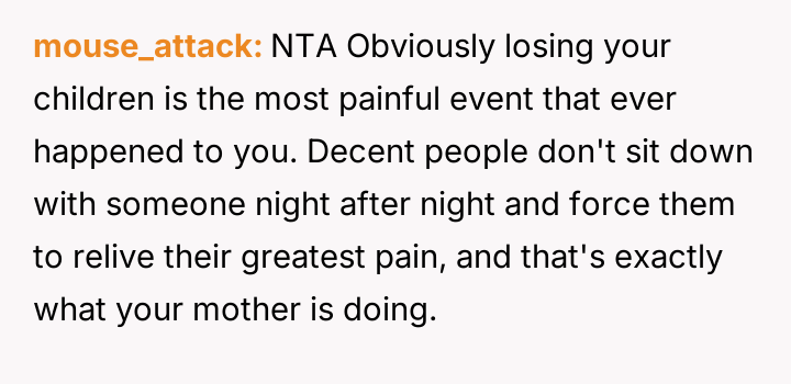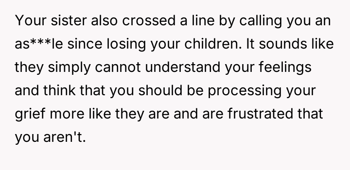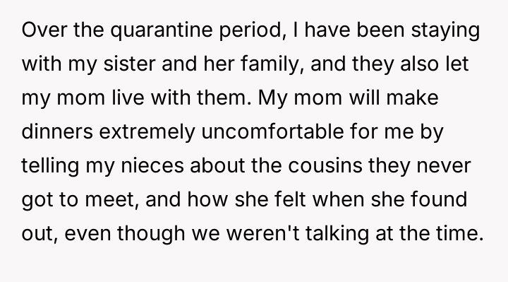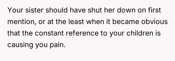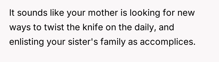 The central conflict arises when the OP's mother repeatedly weaponizes this shared, tragic loss in casual family settings, forcing the OP to confront painful memories and leading to an inevitable confrontation and subsequent departure from the sister's home.