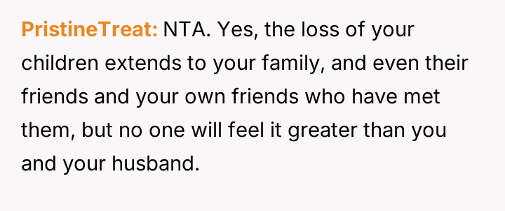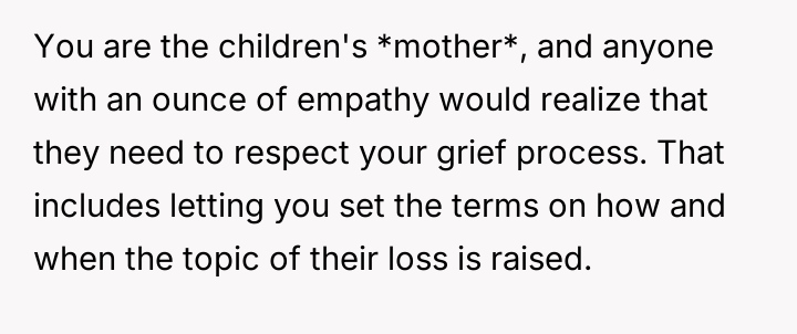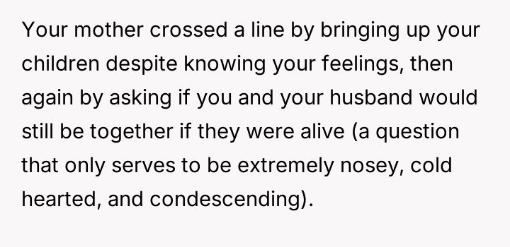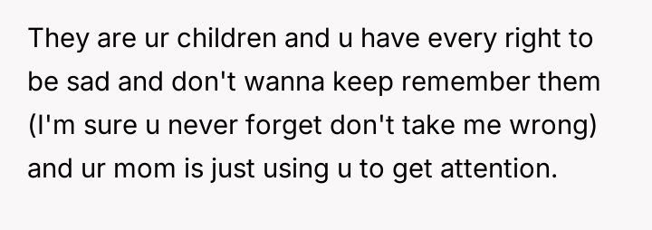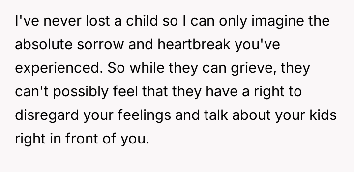 Does the OP have the right to demand absolute silence regarding their deceased children in interactions with their mother, or does the sister's assertion that others, including the mother, also have a right to express their grief, even if inappropriately timed, hold validity? Where should the line be drawn between respecting profound trauma and acknowledging communal loss?