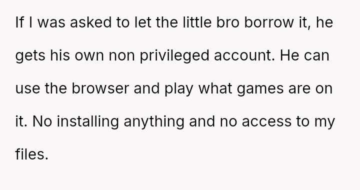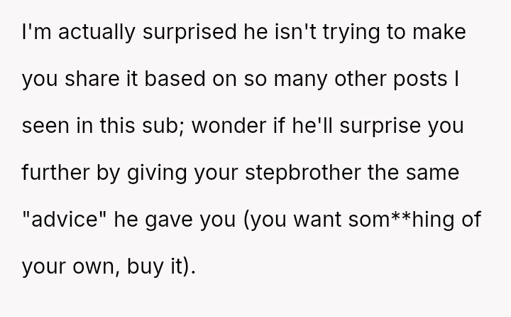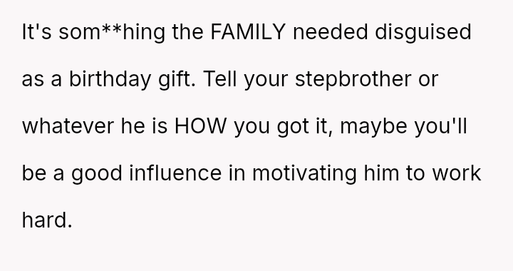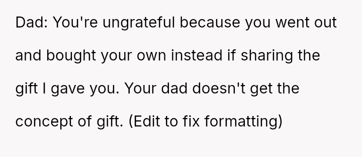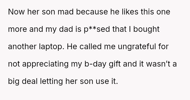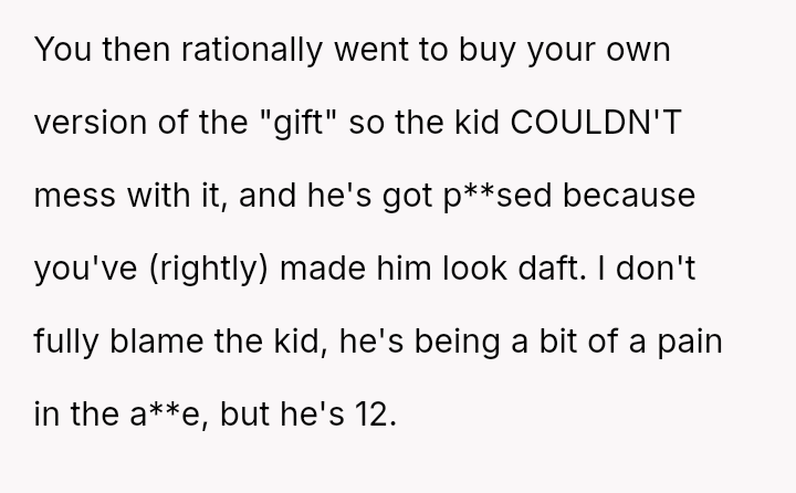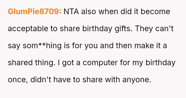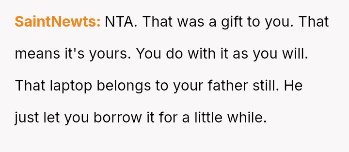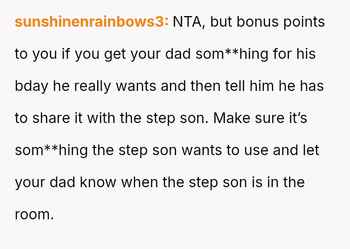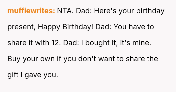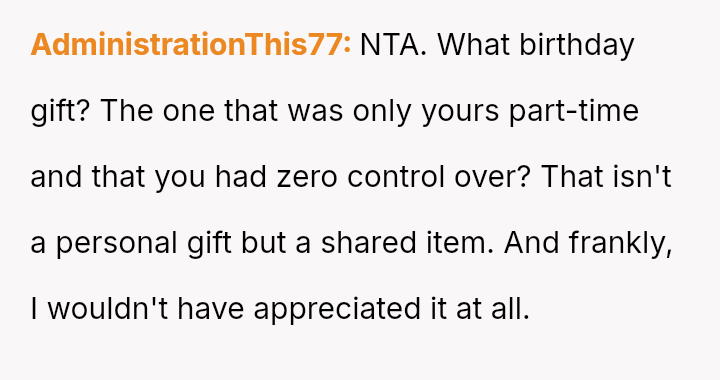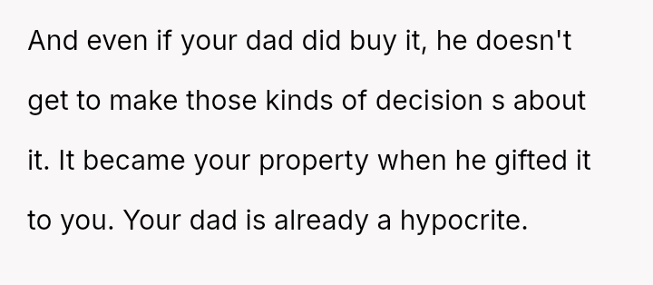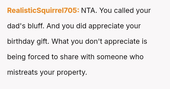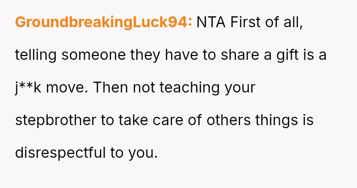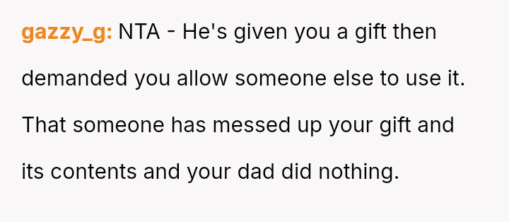 The original poster (OP) felt that their property, given as a birthday gift, was being misused and damaged by a stepsibling, leading to a conflict with their father over usage rights.