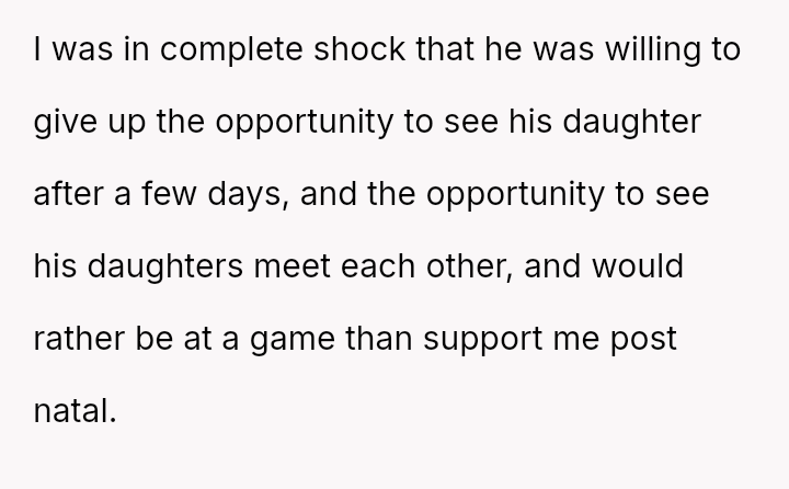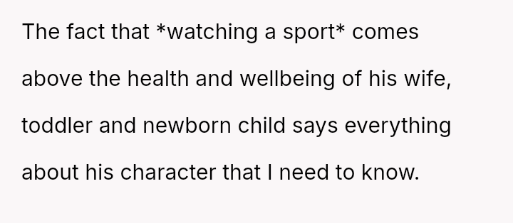 The central conflict is the husband's choice to prioritize attending a football game over being present for crucial first meetings between his two children and supporting his wife post-labor, demonstrating a severe clash between his perceived obligations to leisure and his immediate family responsibilities.