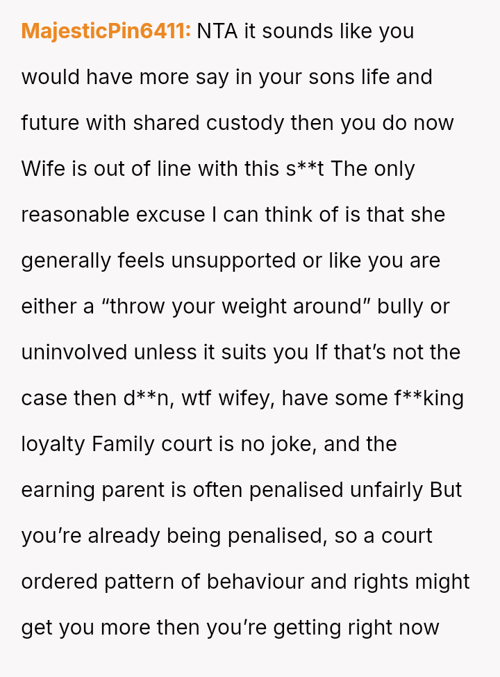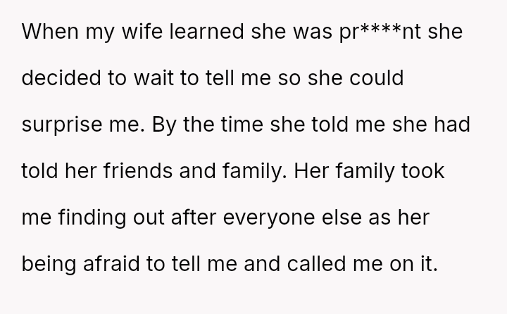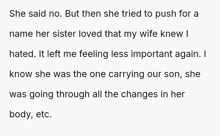 The original poster (OP) feels consistently minimized and excluded by his wife, particularly concerning major life decisions like announcing the pregnancy, choosing a name, and making decisions about their son's activities.
