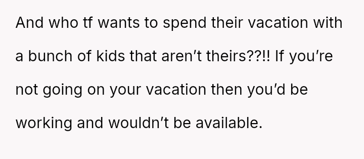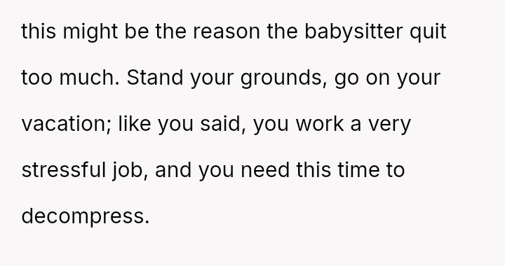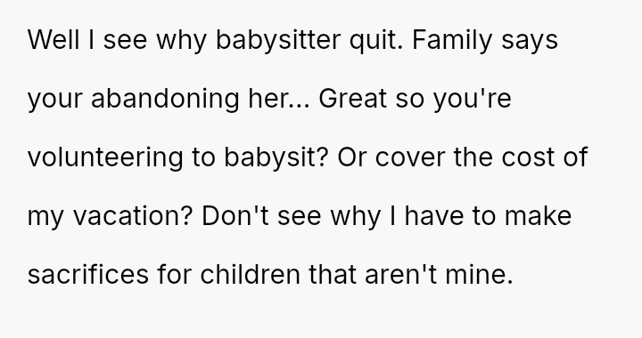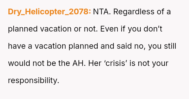 Is the OP justified in upholding their planned solo vacation despite their sister's emergency, or does the immediate, critical need of family, especially children, create an obligation that supersedes personal leisure time? Where should the line be drawn between individual self-care and familial responsibility?